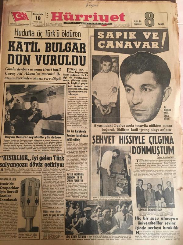 HÜRRİYET GAZETESİ 18 MAYIS 1967 YIL :20 SAYI :6842--Hudutta üç Türk ü öldüren :Katil Bulgar Dün Vuruldu --Kısırlığa iyi gelen Türk salyangozu döviz getiriyor --Bir kız karakolda komiser tarafından iğfal edilmiş --: 8 Yaşındaki Oya ya zorla tecavüz ettikten sonra boğarak öldüren katil iğrenç olayı anlattı Şehvet Hissiyle Çılgına Dönüştüm --Hiç bir suçu olmayan üniversiteliler sevinç içinde serbest bırakıldı --Pazarcılar Esnafı Derneği Pazarlara Baskül Koyacak ---İki doktor ,tek motorlu bir uçakla dünya turu yapacak ---Güreşçilerimiz her gün idman yapıyor ---Altay :2 Bandırma :1---Samsunspor u 4-0 yenen Göztepe finali garantiledi --1967 Anneler Günü Vitrin Yarışması --Kayan Hazarbaba Dağından su ve çamur fışkırıyor --Düğün evinin duvarı çöktü bir genç kız öldü -- Yıpranma, sararmalar, kupon kesiği ve yırtılmalar zamana bağlı olarak görülebilir.