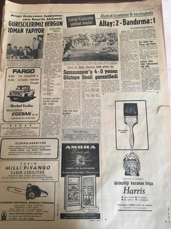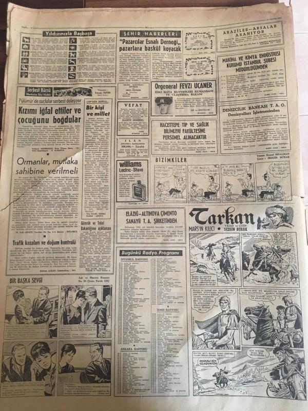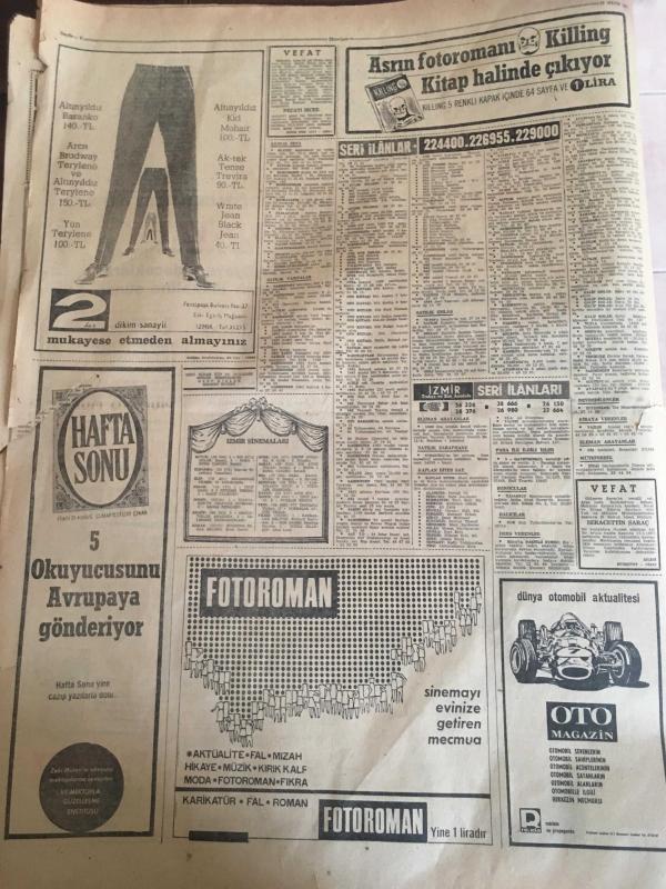 HÜRRİYET GAZETESİ 18 MAYIS 1967 YIL :20 SAYI :6842--Hudutta üç Türk ü öldüren :Katil Bulgar Dün Vuruldu --Kısırlığa iyi gelen Türk salyangozu döviz getiriyor --Bir kız karakolda komiser tarafından iğfal edilmiş --: 8 Yaşındaki Oya ya zorla tecavüz ettikten sonra boğarak öldüren katil iğrenç olayı anlattı Şehvet Hissiyle Çılgına Dönüştüm --Hiç bir suçu olmayan üniversiteliler sevinç içinde serbest bırakıldı --Pazarcılar Esnafı Derneği Pazarlara Baskül Koyacak ---İki doktor ,tek motorlu bir uçakla dünya turu yapacak ---Güreşçilerimiz her gün idman yapıyor ---Altay :2 Bandırma :1---Samsunspor u 4-0 yenen Göztepe finali garantiledi --1967 Anneler Günü Vitrin Yarışması --Kayan Hazarbaba Dağından su ve çamur fışkırıyor --Düğün evinin duvarı çöktü bir genç kız öldü -- adlı eser, Kitap > Süreli Yayınlar > Gazeteler > Türkiye > Genel > Günlük kategorisinde İkinci El olarak satıştadır.