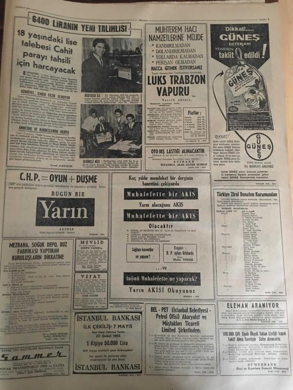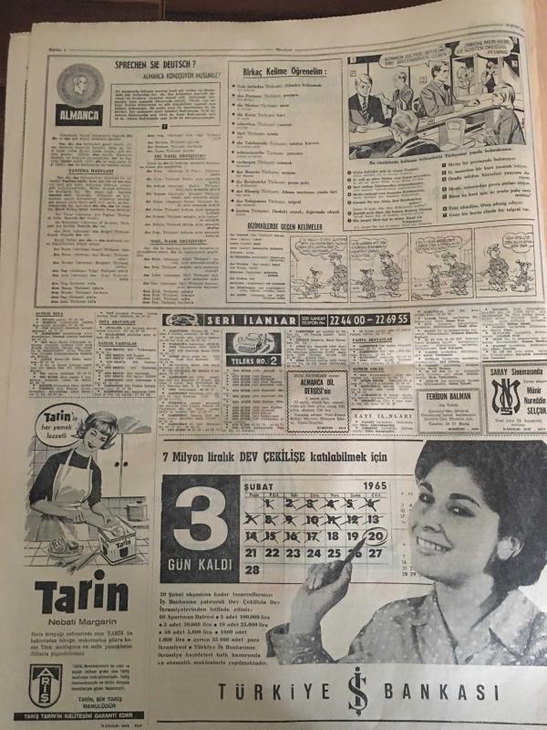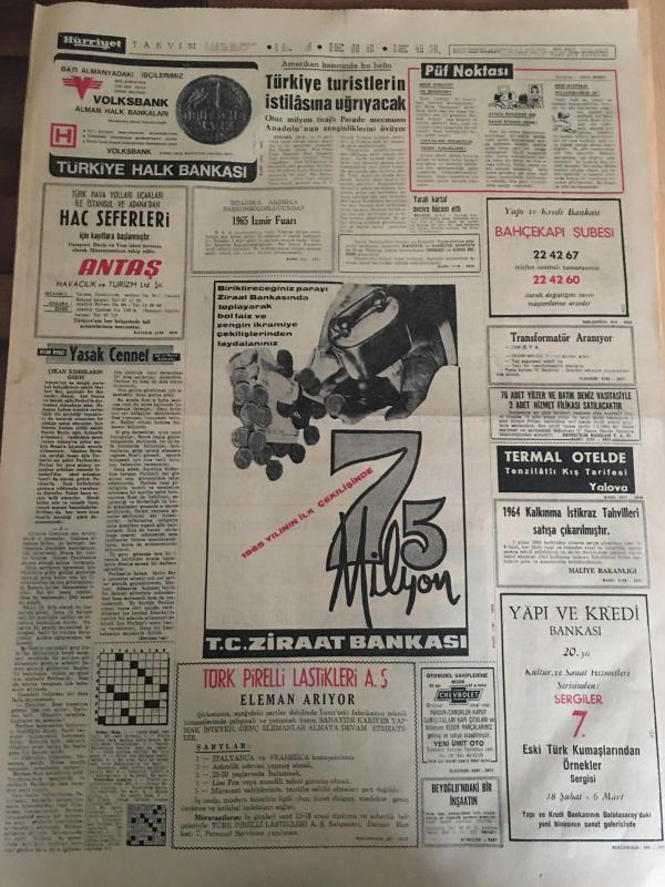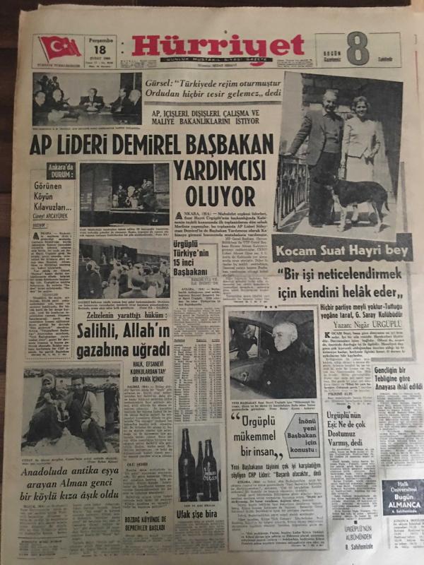 HÜRRİYET GAZETESİ 18 ŞUBAT 1965 YIL :17 SAYI :6036--AP lideri Demirel Başbakan Yardımcısı Oluyor --Salihli ,Allah ın gazabına uğradı ---Ürgüplü Türkiye nin 15 .Başbakanı ---Bu işi neticelendirmek için kendini helak eder ---Anadolu da antika eşya arayan Alman genci bir köylü kıza aşık oldu --Ürgüplü nün eşi ne çok dostumuz varmış dedi ----Şehir su sıkıntısını önlemek için 540 milyon lira lazım --Türkiye turistlerin istilasına uğrayacak ---İtalya liginde futbol faciası ---Ordu Takımımız İran 'ı 1-0 yendi --Fenerbahçe İzmir takımlarından değil ,hakemlerden korkuyor ---Galatasaray Ankara ya gitti ---Milli Takım Kadrosu Martta Açıklanacak ---Lefter in tabiiyet değiştirmesi için de gizli faaliyet gösteriliyor ---Ürgüplü nün Albümünden -- Yıpranma, sararmalar, kupon kesiği ve yırtılmalar zamana bağlı olarak görülebilir.
