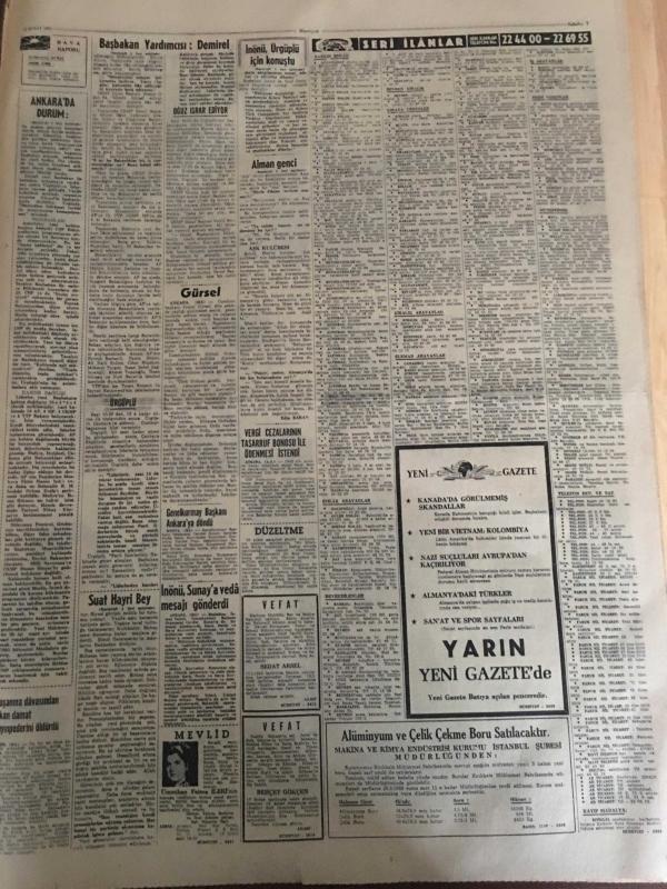HÜRRİYET GAZETESİ 18 ŞUBAT 1965 YIL :17 SAYI :6036--AP lideri Demirel Başbakan Yardımcısı Oluyor --Salihli ,Allah ın gazabına uğradı ---Ürgüplü Türkiye nin 15 .Başbakanı ---Bu işi neticelendirmek için kendini helak eder ---Anadolu da antika eşya arayan Alman genci bir köylü kıza aşık oldu --Ürgüplü nün eşi ne çok dostumuz varmış dedi ----Şehir su sıkıntısını önlemek için 540 milyon lira lazım --Türkiye turistlerin istilasına uğrayacak ---İtalya liginde futbol faciası ---Ordu Takımımız İran 'ı 1-0 yendi --Fenerbahçe İzmir takımlarından değil ,hakemlerden korkuyor ---Galatasaray Ankara ya gitti ---Milli Takım Kadrosu Martta Açıklanacak ---Lefter in tabiiyet değiştirmesi için de gizli faaliyet gösteriliyor ---Ürgüplü nün Albümünden --, SEDAT SİMAVİ tarafından kaleme alınmıştır. Kitap 1965 yılında [HÜRRİYET MATBAA] yayınlanmıştır. 8 sayfadır. HÜRRİYET GAZETESİ 18 ŞUBAT 1965 YIL :17 SAYI :6036--AP lideri Demirel Başbakan Yardımcısı Oluyor --Salihli ,Allah ın gazabına uğradı ---Ürgüplü Türkiye nin 15 .Başbakanı ---Bu işi neticelendirmek için kendini helak eder ---Anadolu da antika eşya arayan Alman genci bir köylü kıza aşık oldu --Ürgüplü nün eşi ne çok dostumuz varmış dedi ----Şehir su sıkıntısını önlemek için 540 milyon lira lazım --Türkiye turistlerin istilasına uğrayacak ---İtalya liginde futbol faciası ---Ordu Takımımız İran 'ı 1-0 yendi --Fenerbahçe İzmir takımlarından değil ,hakemlerden korkuyor ---Galatasaray Ankara ya gitti ---Milli Takım Kadrosu Martta Açıklanacak ---Lefter in tabiiyet değiştirmesi için de gizli faaliyet gösteriliyor ---Ürgüplü nün Albümünden -- adlı eser Türkçe dilindedir.