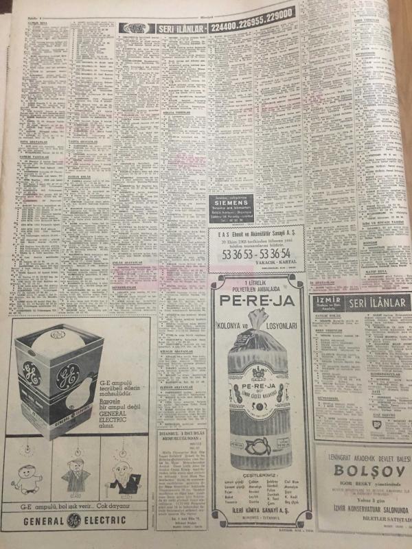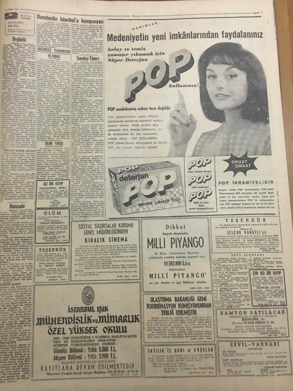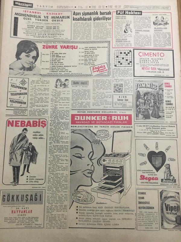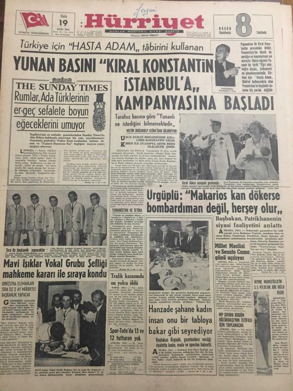 HÜRRİYET GAZETESİ 19 EKİM 1965 YIL :18 SAYI :6276---Yunan Basını Kıral Konstantin İstanbul a Kampanyasına Başladı --Rumlar ,Ada Türklerinin Er Geç Sefalete Boyun Eğeceklerini Umuyor ---Ürgüplü :Makarios kan dökerse bombardıman değil her şey olur ---Mavi Işıklar Vokal Grubu Şefliği Mahkeme Kararı İle Sıraya Kondu ---Hanzade şahane kadın insan onu bir tabloya bakar gibi seyrediyor --Trafik kazasında on yolcu öldü ---Aşırı şişmanlık barsak kısaltılarak gideriliyor ---Kılıç :Galatasaray yavaş yavaş forma giriyor ---Namzet Kadrolar Kampta ---Fenerbahçe nin antrenörü neticeden memnun --5 Kız 5 erkek 10 çocuktan sonra 53 yaşında bir daha doğurdu --Kocalarınıza çirkin taraflarınızı göstermeyiniz ---MP Grubu Bugün Bölükbaşını nın İstifası İçin Toplanacak --Spor -Toto da 13 ve 12 tutturan yok -- Yıpranma, sararmalar, kupon kesiği ve yırtılmalar zamana bağlı olarak görülebilir.