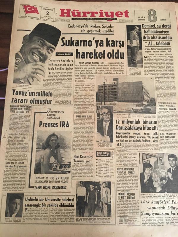HÜRRİYET GAZETESİ 2 EKİM 1965 YIL :18 SAYI :6259--- Endonezya da iktidarı ,solcular ele geçirmek istedi ---Sukarno 'ya karşı hareket oldu ---Demirel ,su derdi halledilemeyen Urfa ahalisinden af talep etti --- 12 milyonluk binasını Darüşşafakaya hibe ettiler ---Jet Sosyetesinin taçsız kraliçesi Prenses İra ----Türk kuaförleri Paris te yapılacak Dünya Şampiyonasına katılıyor---Zayıflama kulübü üyelerine perhizden çok şarkı ve dans etme tavsiyesinde bulunuyor ---Vefa ,başarısını devam ettirmeğe çalışacak ---Beşiktaş için zorlu mücadele ---Galatasaray güç durumda----Şaban Filiz çalışmak için Almanya ya gidiyor ---Belgin Doruk : Avrupa da bir ay dinleneceğim ---Sevda Ferdağ , şimdi de çengiliğe özendi ---- Yıpranma, sararmalar, kupon kesiği ve yırtılmalar zamana bağlı olarak görülebilir.