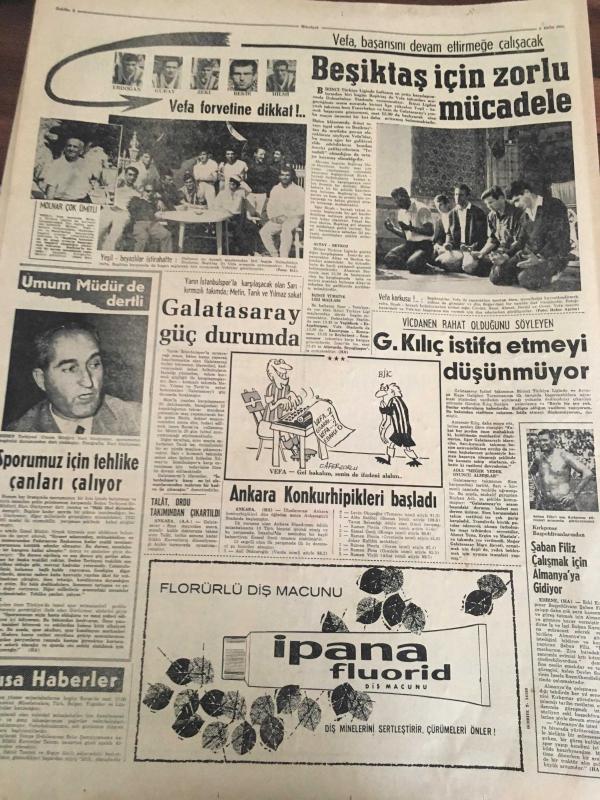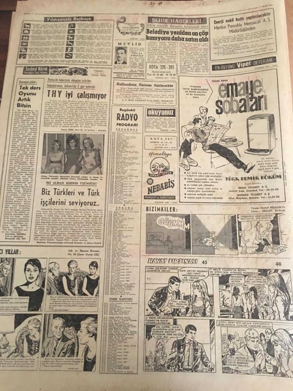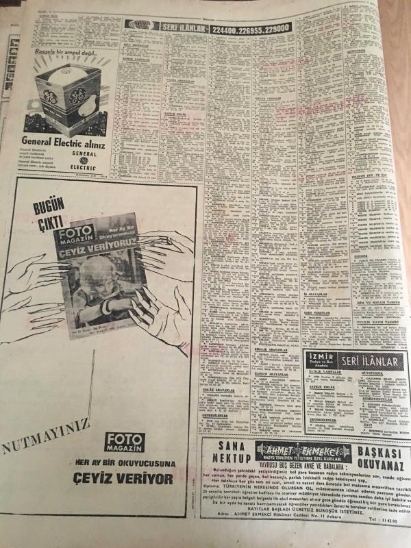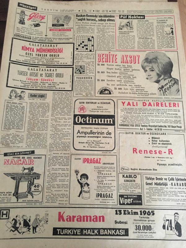 HÜRRİYET GAZETESİ 2 EKİM 1965 YIL :18 SAYI :6259-Gündüz Kılıç-Behiye Aksoy ,Şençalar Plak reklamı-Marc Aryan,Adamo-İpana,Zetina,Türkiye Halk Bankası,Galatasaray Kimya Mühendisliği Yüksek Okulu,Özel Galatasaray Yüksek İktisat ve Ticaret Okulu reklamları--- Endonezya da iktidarı ,solcular ele geçirmek istedi ---Sukarno 'ya karşı hareket oldu ---Demirel ,su derdi halledilemeyen Urfa ahalisinden af talep etti --- 12 milyonluk binasını Darüşşafakaya hibe ettiler ---Jet Sosyetesinin taçsız kraliçesi Prenses İra ----Türk kuaförleri Paris te yapılacak Dünya Şampiyonasına katılıyor---Zayıflama kulübü üyelerine perhizden çok şarkı ve dans etme tavsiyesinde bulunuyor ---Vefa ,başarısını devam ettirmeğe çalışacak ---Beşiktaş için zorlu mücadele ---Galatasaray güç durumda----Şaban Filiz çalışmak için Almanya ya gidiyor ---Belgin Doruk : Avrupa da bir ay dinleneceğim ---Sevda Ferdağ , şimdi de çengiliğe özendi ----, SEDAT SİMAVİ tarafından kaleme alınmıştır. Kitap 1966 yılında [HÜRRİYET MATBAA] yayınlanmıştır. 8 sayfadır. HÜRRİYET GAZETESİ 2 EKİM 1965 YIL :18 SAYI :6259-Gündüz Kılıç-Behiye Aksoy ,Şençalar Plak reklamı-Marc Aryan,Adamo-İpana,Zetina,Türkiye Halk Bankası,Galatasaray Kimya Mühendisliği Yüksek Okulu,Özel Galatasaray Yüksek İktisat ve Ticaret Okulu reklamları--- Endonezya da iktidarı ,solcular ele geçirmek istedi ---Sukarno 'ya karşı hareket oldu ---Demirel ,su derdi halledilemeyen Urfa ahalisinden af talep etti --- 12 milyonluk binasını Darüşşafakaya hibe ettiler ---Jet Sosyetesinin taçsız kraliçesi Prenses İra ----Türk kuaförleri Paris te yapılacak Dünya Şampiyonasına katılıyor---Zayıflama kulübü üyelerine perhizden çok şarkı ve dans etme tavsiyesinde bulunuyor ---Vefa ,başarısını devam ettirmeğe çalışacak ---Beşiktaş için zorlu mücadele ---Galatasaray güç durumda----Şaban Filiz çalışmak için Almanya ya gidiyor ---Belgin Doruk : Avrupa da bir ay dinleneceğim ---Sevda Ferdağ , şimdi de çengiliğe özendi ---- adlı eser Türkçe dilindedir.