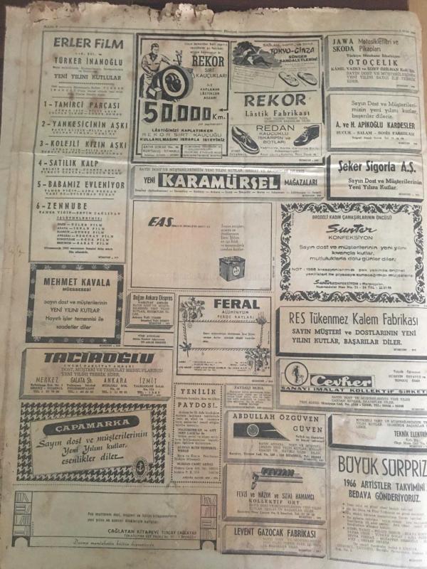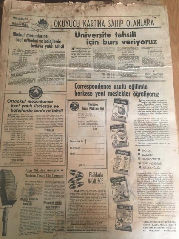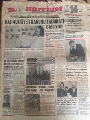 HÜRRİYET GAZETESİ 2 OCAK 1966 YIL :18 SAYI :6351---Kat Mülkiyeti Kanunu Tatbikatı Başlıyor ---18 Yaşındaki kızını kestikten sonra 22 yerinden bıçakladı ---Birbirlerini vuruyor sonra elini öpüp ,özür diliyorlar ---13 Tutturmasına rağmen parasını alamayan totocu cehaletin kurbanı oldu ---Amerikalı milyoner Rufus 'un evlat edindiği Türk kızının ilk imtihanı başarılı geçti ---İlkokul bitirenlerin yarısı tahsil yapmıyor --Perişanım Türküsü :Ahmet Sezgin ---20 haydut Londra posta treni soyguncularını kaçırmaktan vazgeçti ---Günde 2.000 ayda 60 bin yılda 720 bin lira dağıtıyor ---Kısmet artık Atlantik sularında ---Göztepe :0 D.Spor :0 --Beşiktaş ,H.Tepe yi penaltı ile yendi :1-0---Beykoz ,Ank.Gücünden kıymetli 2 puan aldı: 1-0--Şekerspor :2 Vefa : 0---Plaza nın istifası müsbet karşılandı --Afrika da yılbaşı gecesi hükümet darbesi oldu -- Yıpranma, sararmalar, kupon kesiği ve yırtılmalar zamana bağlı olarak görülebilir.