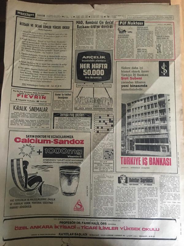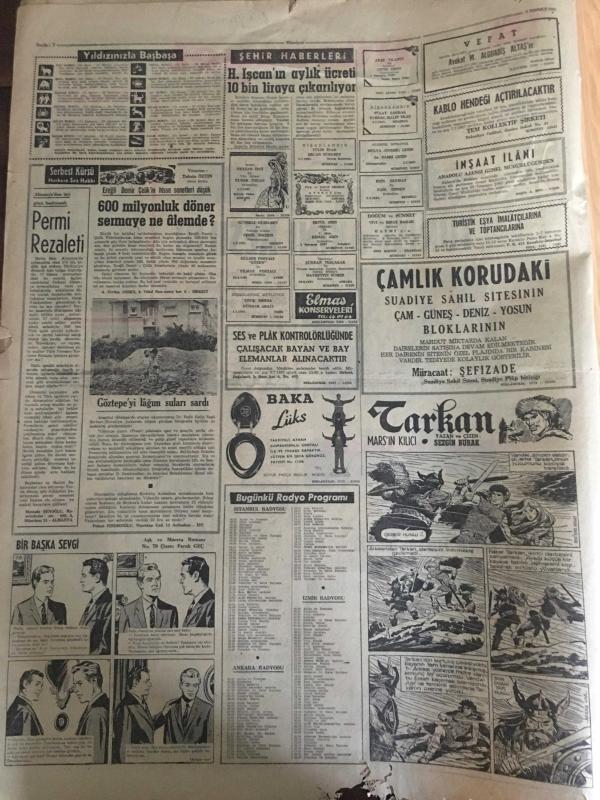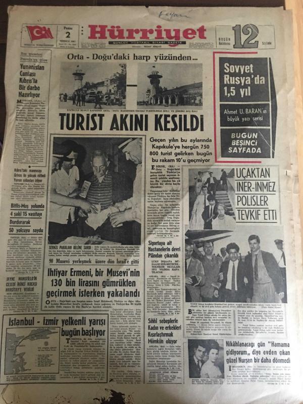 HÜRRİYET GAZETESİ 2 TEMMUZ 1967 YIL :20 SAYI :6887---Yunanistan Cuntası Kıbrıs ta Bir Darbe Hazırlıyor --Turist akını kesildi ---Bitlis -Muş yolunda 4 şaki 15 vasıtayı durdurarak 50 yolcu soydu ---İhtar Ermeni bir Musevi nin 130 bin lirasını gümrükten geçirmek isterken yakalandı --Sigortaya ait hastanelerin devri plandan çıkarıldı ---Sıhhi sebeplerle kadın ve erkekleri kısırlaştırmak mümkün ---H.İşcan ın aylık ücreti 10 bin liraya çıkarılıyor ---Mao Komünist Çin Devler Başkanı LİU yu devirdi ---Sovyetler Birliğinde Uçaktan Fotoğraf Çekmek Yasak --Sovyet Rusya da 1,5 yıl : Yabancılar Moskova dan başka yerde yaşayamaz ---Turgay ın jübile maçı bu gece :Elveda Futbol ---İstanbulsporlu Gökmen ve Yasin Galatasaraylı oldular ---Yasin ,lefter Can ve Metin i unutamıyor ---Uçaktan iner inmez polisler tevkif etti ---Nikahlanacağı gün hamama gidiyorum diye evden çıkan güzel Nurşen bir daha dönmedi ---Kıbrıs ta ki manevrayı Grivas ilr yüksek rütbeli Yunan subayları izliyor --- adlı eser, Kitap > Süreli Yayınlar > Gazeteler > Türkiye > Genel > Günlük kategorisinde İkinci El olarak satıştadır.