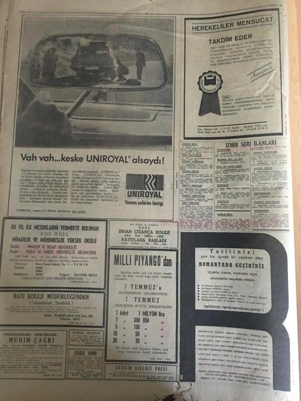 HÜRRİYET GAZETESİ 2 TEMMUZ 1967 YIL :20 SAYI :6887---Yunanistan Cuntası Kıbrıs ta Bir Darbe Hazırlıyor --Turist akını kesildi ---Bitlis -Muş yolunda 4 şaki 15 vasıtayı durdurarak 50 yolcu soydu ---İhtar Ermeni bir Musevi nin 130 bin lirasını gümrükten geçirmek isterken yakalandı --Sigortaya ait hastanelerin devri plandan çıkarıldı ---Sıhhi sebeplerle kadın ve erkekleri kısırlaştırmak mümkün ---H.İşcan ın aylık ücreti 10 bin liraya çıkarılıyor ---Mao Komünist Çin Devler Başkanı LİU yu devirdi ---Sovyetler Birliğinde Uçaktan Fotoğraf Çekmek Yasak --Sovyet Rusya da 1,5 yıl : Yabancılar Moskova dan başka yerde yaşayamaz ---Turgay ın jübile maçı bu gece :Elveda Futbol ---İstanbulsporlu Gökmen ve Yasin Galatasaraylı oldular ---Yasin ,lefter Can ve Metin i unutamıyor ---Uçaktan iner inmez polisler tevkif etti ---Nikahlanacağı gün hamama gidiyorum diye evden çıkan güzel Nurşen bir daha dönmedi ---Kıbrıs ta ki manevrayı Grivas ilr yüksek rütbeli Yunan subayları izliyor ---, SEDAT SİMAVİ tarafından kaleme alınmıştır. Kitap 1967 yılında [HÜRRİYET MATBAA] yayınlanmıştır. 8 sayfadır. HÜRRİYET GAZETESİ 2 TEMMUZ 1967 YIL :20 SAYI :6887---Yunanistan Cuntası Kıbrıs ta Bir Darbe Hazırlıyor --Turist akını kesildi ---Bitlis -Muş yolunda 4 şaki 15 vasıtayı durdurarak 50 yolcu soydu ---İhtar Ermeni bir Musevi nin 130 bin lirasını gümrükten geçirmek isterken yakalandı --Sigortaya ait hastanelerin devri plandan çıkarıldı ---Sıhhi sebeplerle kadın ve erkekleri kısırlaştırmak mümkün ---H.İşcan ın aylık ücreti 10 bin liraya çıkarılıyor ---Mao Komünist Çin Devler Başkanı LİU yu devirdi ---Sovyetler Birliğinde Uçaktan Fotoğraf Çekmek Yasak --Sovyet Rusya da 1,5 yıl : Yabancılar Moskova dan başka yerde yaşayamaz ---Turgay ın jübile maçı bu gece :Elveda Futbol ---İstanbulsporlu Gökmen ve Yasin Galatasaraylı oldular ---Yasin ,lefter Can ve Metin i unutamıyor ---Uçaktan iner inmez polisler tevkif etti ---Nikahlanacağı gün hamama gidiyorum diye evden çıkan güzel Nurşen bir daha dönmedi ---Kıbrıs ta ki manevrayı Grivas ilr yüksek rütbeli Yunan subayları izliyor --- adlı eser Türkçe dilindedir.