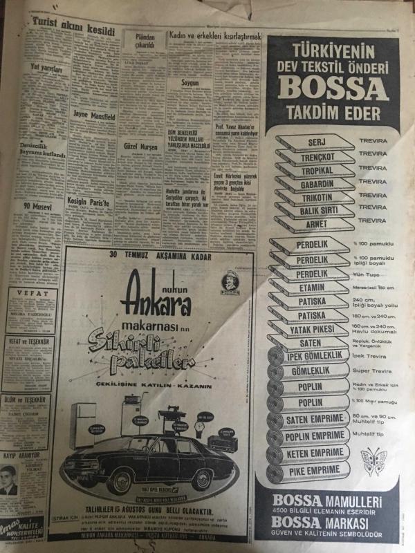HÜRRİYET GAZETESİ 2 TEMMUZ 1967 YIL :20 SAYI :6887---Yunanistan Cuntası Kıbrıs ta Bir Darbe Hazırlıyor --Turist akını kesildi ---Bitlis -Muş yolunda 4 şaki 15 vasıtayı durdurarak 50 yolcu soydu ---İhtar Ermeni bir Musevi nin 130 bin lirasını gümrükten geçirmek isterken yakalandı --Sigortaya ait hastanelerin devri plandan çıkarıldı ---Sıhhi sebeplerle kadın ve erkekleri kısırlaştırmak mümkün ---H.İşcan ın aylık ücreti 10 bin liraya çıkarılıyor ---Mao Komünist Çin Devler Başkanı LİU yu devirdi ---Sovyetler Birliğinde Uçaktan Fotoğraf Çekmek Yasak --Sovyet Rusya da 1,5 yıl : Yabancılar Moskova dan başka yerde yaşayamaz ---Turgay ın jübile maçı bu gece :Elveda Futbol ---İstanbulsporlu Gökmen ve Yasin Galatasaraylı oldular ---Yasin ,lefter Can ve Metin i unutamıyor ---Uçaktan iner inmez polisler tevkif etti ---Nikahlanacağı gün hamama gidiyorum diye evden çıkan güzel Nurşen bir daha dönmedi ---Kıbrıs ta ki manevrayı Grivas ilr yüksek rütbeli Yunan subayları izliyor --- Yıpranma, sararmalar, kupon kesiği ve yırtılmalar zamana bağlı olarak görülebilir.