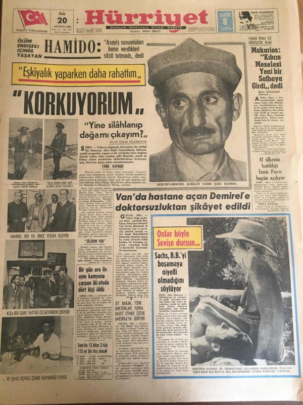 HÜRRİYET GAZETESİ 20 AĞUSTOS 1968 YIL :21 SAYI :7297---Hamido :Eşkiyalık yaparken daha rahattım ---Korkuyorum :Yine Silahlanıp dağa mı çıkayım ?--Van da hastane açan Demirel e doktorsuzluktan şikayet edildi ---Makarios : Kıbrıs meselesi yeni bir safhaya girdi dedi ----Bir ara ile aynı kamyona çarpan iki oto da dört kişi öldü ----Sessiz sinemanın seks bombası Mae West uzun yıllar sonra 76 yaşında yeni bir filmde rol alacak ---Fenerbahçe ,her mevkin tek adam ını arıyor ---Cemil Erkök : Disipline uymayana güreş yok ---Osman gitti Kuzman geldi --Fenerbahçe taraftarlarının ateşli olduklarını duyduk ---Dünyanın en küçük Go-Kart sürücüsü henüz 4 yaşında ---New York ta inşa edilen çarşıda 58 dükkan var ---Toto da 13 bilen 3 kişi 115 er bin lira alacak --42 Ülkenin katıldığı İzmir Fuarı Bugün açılıyor ---Jet Bakan Türk Doktorları Yurda Davet Etmek Üzere Amerika ya Gidiyor ---, SEDAT SİMAVİ tarafından kaleme alınmıştır. Kitap 1968 yılında [HÜRRİYET MATBAA] yayınlanmıştır. 8 sayfadır. HÜRRİYET GAZETESİ 20 AĞUSTOS 1968 YIL :21 SAYI :7297---Hamido :Eşkiyalık yaparken daha rahattım ---Korkuyorum :Yine Silahlanıp dağa mı çıkayım ?--Van da hastane açan Demirel e doktorsuzluktan şikayet edildi ---Makarios : Kıbrıs meselesi yeni bir safhaya girdi dedi ----Bir ara ile aynı kamyona çarpan iki oto da dört kişi öldü ----Sessiz sinemanın seks bombası Mae West uzun yıllar sonra 76 yaşında yeni bir filmde rol alacak ---Fenerbahçe ,her mevkin tek adam ını arıyor ---Cemil Erkök : Disipline uymayana güreş yok ---Osman gitti Kuzman geldi --Fenerbahçe taraftarlarının ateşli olduklarını duyduk ---Dünyanın en küçük Go-Kart sürücüsü henüz 4 yaşında ---New York ta inşa edilen çarşıda 58 dükkan var ---Toto da 13 bilen 3 kişi 115 er bin lira alacak --42 Ülkenin katıldığı İzmir Fuarı Bugün açılıyor ---Jet Bakan Türk Doktorları Yurda Davet Etmek Üzere Amerika ya Gidiyor --- adlı eser Türkçe dilindedir.