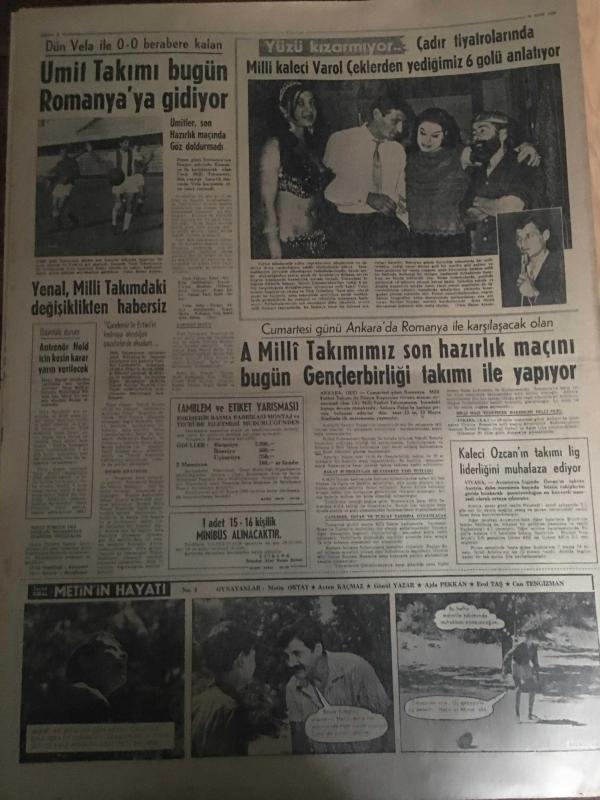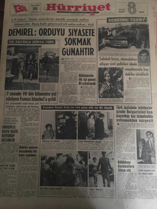 HÜRRİYET GAZETESİ 20 EKİM 1965 YIL :18 SAYI :6277--Demirel :Orduyu siyasete sokmak günahtır --7 senede 70 bin kilometre yol yürüyen Fransız İstanbul a geldi ---Ürgüplü :Hava Güzel Buyurup Gelsinler ---Hükümetin ilk işi genel af çıkarmak ---Bakiye oyların hesabında bir hata yapılmış --Maraş ta ki kaza da ölü sayısı 14 oldu --Sabıkalı hırsız ,otomobiline atlayan sivil polisleri iskele meydanında beş dakika sürükledi ---Türk işçisinin tehlikeler içinde Bulgaristan dan kaçırdığı kız İstanbul da evlenmekten vazgeçti ---Bölükbaşı Gazetecilere Sitem Etti --Ümit Takımı Bugün Romanya ya gidiyor --Yenal ,Milli Takımdaki Değişiklikten Habersiz ---A Milli Takımızın son hazırlık maçını bugün Gençlerbirliği takımı ile yapıyor ---Yaramaz Mavruk Amerika da alim oldu ---Çilli prenses Selameti kaçmakta buldu -- Yıpranma, sararmalar, kupon kesiği ve yırtılmalar zamana bağlı olarak görülebilir.
