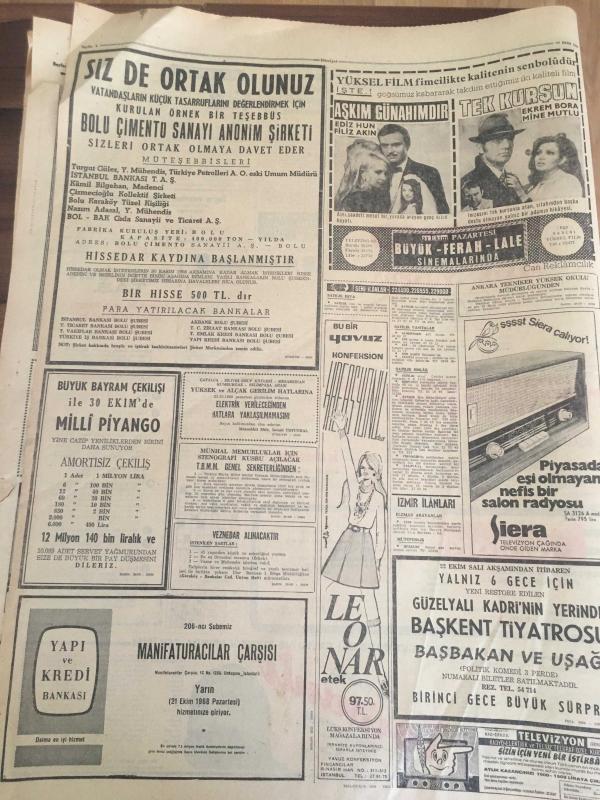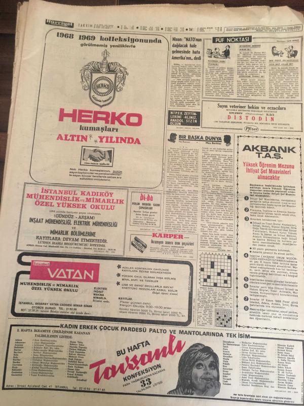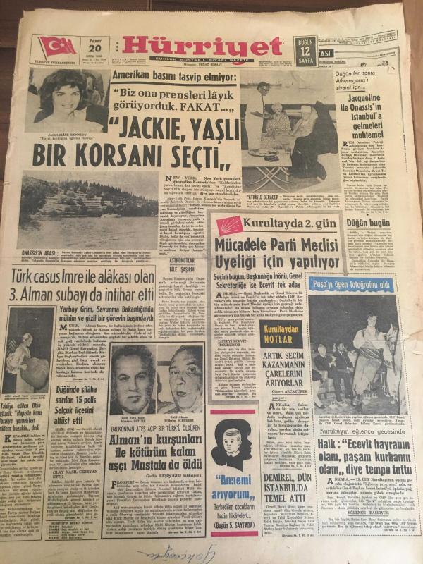 HÜRRİYET GAZETESİ 20 EKİM 1968 YIL :21 SAYI :7358--Amerikan basını tasvip etmiyor : Biz ona prenslerin layık görüyorduk .Fakat Jackıe , yaşlı bir korsanı seçti --Türk casus İmre ile alakası olan 3. Alman subayı da intihar etti -- Mücadele Parti Meclisi Üyeliği İçin Yapılıyor -- Halk :Ecevit hayranını olam , paşam kurbanın olam diye tempo tuttu --Demirel , dün İstanbul da temel attı ---Nixon :NATO 'nun dağılacak hale gelmesinde hata Amerika 'nın dedi ---Sevinç ,Akdağ ,Ağralı ve Atalay galip : Esenceli ve Yılmaz elendi --Uzun atlamanın 8 yıllık saltanatına son verildi --- Fenerbahçe -Beşiktaş -Galatasaray --Vefa --İsmail Akçay Bugün Yarışıyor ---Alman 'ın kurşunları ile kötürüm kalan aşçı Mustafa da öldü -- Kurultay da notlar artık seçimin notlarını arıyorlar --- Yıpranma, sararmalar, kupon kesiği ve yırtılmalar zamana bağlı olarak görülebilir.
