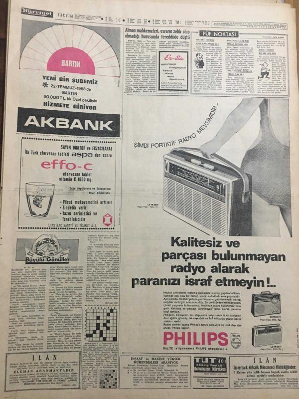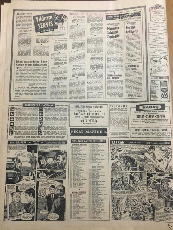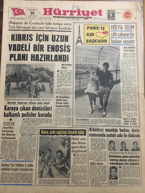 HÜRRİYET GAZETESİ 20 TEMMUZ 1968 YIL :21 SAYI :7266--Kıbrıs için uzun vadeli bir Enosis planı hazırlandı ---Karaya çıkan denizcileri kalkanlı polisler korudu ---AP, tutanaklarının iptaline karşı itirazını seçim kuruluna veriyor ---Nikahsız yaşadığı kadını ,deniz motorunda sustalı çakı ile öldürdü ---Paris te aşk başkadır :Hülya -Selim çifti şahane bir balayı yaşıyor ---Alman mahkemeleri ,esrarını zehir olup olmadığı hususunda tereddüde düştü --Fenerbahçe yeni sezona sıkıyönetimle giriyor --Puanlı yüzme yarışlarının ilk gününde tek rekor kırıldı ---PTT de yeni futbol yılına ilk adımı attı ---Milan ,Riva ya 21 milyon lira teklif etti ---Ogün gol değil dönmek için fırsat arıyor ---Kumrular gibi sevişiyorlar ---Üzerlerine gelen motordan korkup denize atlayan 4 arkadaştan biri boğuldu ---Haluk adını alan Alman genci dinini değiştirecek --- Yıpranma, sararmalar, kupon kesiği ve yırtılmalar zamana bağlı olarak görülebilir.