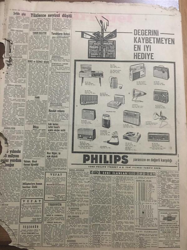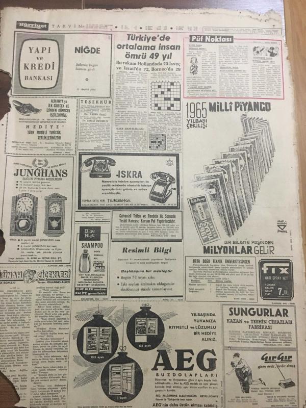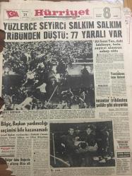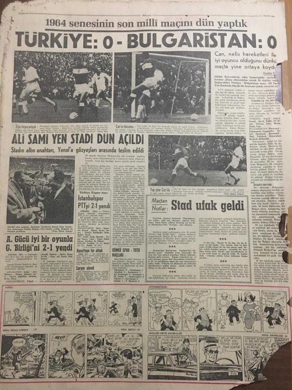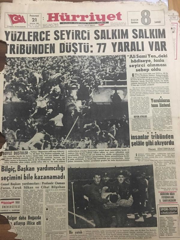 HÜRRİYET GAZETESİ 21 ARALIK 1964 YIL :17 SAYI :5979---Yüzlerce seyirci salkım salkım tribünden düştü :77 yaralı var ---Bilgiç ,Başkan yardımcılığı seçimini bile kazanamadı ---Ali Sami Yen de ki hadiseye fazla seyirci alınması sebep oldu ---İstanbul un sanayi inkişaf bölgeleri tespit ediliyor ---Türkiye de ortalama insan ömrü 49 yıl ---İsveçli ilkokulda öğrendiği cinsi bilgiyi tatbika başlar ----Türkiye :0 Bulgaristan :0 ---Ali Sami Yen Stadı Dün Açıldı ---A.Gücü iyi bir oyunla G.Birliği ni 2-1 yendi ----Hasılat Rekoru ---Radyo Programları ---Mısır Migleri bir uçak düşürdü ---Dünkü panikten resimler ---İnsanlar tribünden şelale gibi akıyordu ---Yaralıların tam listesi ---İstanbulspor PTT yi 2-1 yendi ---Stad ufak geldi --- Yıpranma, sararmalar, kupon kesiği ve yırtılmalar zamana bağlı olarak görülebilir.