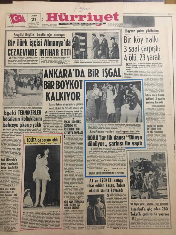 HÜRRİYET GAZETESİ 21 HAZİRAN 1968 YIL :21 SAYI :7237--Bir Türk İşçisi Almanya da Cezaevinde İntihar Etti ---Ankara da bir işgal bir boykot kalkıyor ---İşgalci Teknikerler Hocaların Koltuklarını Bahçeye Çıkarıp Yaktı ---Kral Hüseyin e karşı yapılacak darbe bastırıldı ---İşgal Komitesi Reform ve İstekleri bir Kitap ta Topladı ---Bir köy halkı 3 saat çarpıştı :4 ölü ,23 yaralı ---Boro lar ilk dansı Dünya dönüyor şarkısı ile yaptı ---At ve eşek eti sattığı ihbar edilen kasap ,zabıta ekibini satırla kovaladı ----İstanbul a göç eden 280 Tokatlı çadırlarda yaşıyor ----Hülya Koçyiğit :Fenerbahçe derken galiba Beşiktaş a gelin gidiyorum ---Selim 100 bin liralık mobilya ısmarladı ----Metin :Antrenör olmak için daha çok erken dedi ---Antrenörlerimiz ne biliyor ki futbolcuya ne öğrensinler ?--Yusuf un babası para bulamıyor --Molnar : Gayemiz yenilmemek ---Gelecek ay Almanya ya 10 bin işçi gönderilecek ----Boro lara hediye yağdı -- Yıpranma, sararmalar, kupon kesiği ve yırtılmalar zamana bağlı olarak görülebilir.