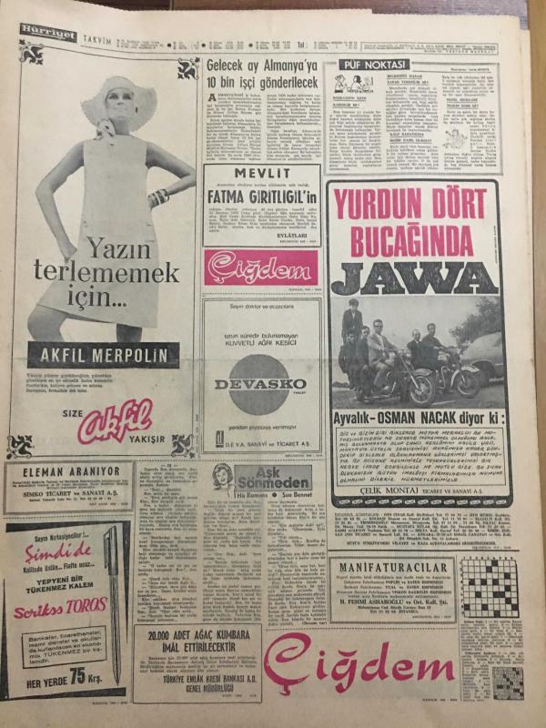 HÜRRİYET GAZETESİ 21 HAZİRAN 1968 YIL :21 SAYI :7237--Bir Türk İşçisi Almanya da Cezaevinde İntihar Etti ---Ankara da bir işgal bir boykot kalkıyor ---İşgalci Teknikerler Hocaların Koltuklarını Bahçeye Çıkarıp Yaktı ---Kral Hüseyin e karşı yapılacak darbe bastırıldı ---İşgal Komitesi Reform ve İstekleri bir Kitap ta Topladı ---Bir köy halkı 3 saat çarpıştı :4 ölü ,23 yaralı ---Boro lar ilk dansı Dünya dönüyor şarkısı ile yaptı ---At ve eşek eti sattığı ihbar edilen kasap ,zabıta ekibini satırla kovaladı ----İstanbul a göç eden 280 Tokatlı çadırlarda yaşıyor ----Hülya Koçyiğit :Fenerbahçe derken galiba Beşiktaş a gelin gidiyorum ---Selim 100 bin liralık mobilya ısmarladı ----Metin :Antrenör olmak için daha çok erken dedi ---Antrenörlerimiz ne biliyor ki futbolcuya ne öğrensinler ?--Yusuf un babası para bulamıyor --Molnar : Gayemiz yenilmemek ---Gelecek ay Almanya ya 10 bin işçi gönderilecek ----Boro lara hediye yağdı --, SEDAT SİMAVİ tarafından kaleme alınmıştır. Kitap 1968 yılında [HÜRRİYET MATBAA] yayınlanmıştır. 12 sayfadır. HÜRRİYET GAZETESİ 21 HAZİRAN 1968 YIL :21 SAYI :7237--Bir Türk İşçisi Almanya da Cezaevinde İntihar Etti ---Ankara da bir işgal bir boykot kalkıyor ---İşgalci Teknikerler Hocaların Koltuklarını Bahçeye Çıkarıp Yaktı ---Kral Hüseyin e karşı yapılacak darbe bastırıldı ---İşgal Komitesi Reform ve İstekleri bir Kitap ta Topladı ---Bir köy halkı 3 saat çarpıştı :4 ölü ,23 yaralı ---Boro lar ilk dansı Dünya dönüyor şarkısı ile yaptı ---At ve eşek eti sattığı ihbar edilen kasap ,zabıta ekibini satırla kovaladı ----İstanbul a göç eden 280 Tokatlı çadırlarda yaşıyor ----Hülya Koçyiğit :Fenerbahçe derken galiba Beşiktaş a gelin gidiyorum ---Selim 100 bin liralık mobilya ısmarladı ----Metin :Antrenör olmak için daha çok erken dedi ---Antrenörlerimiz ne biliyor ki futbolcuya ne öğrensinler ?--Yusuf un babası para bulamıyor --Molnar : Gayemiz yenilmemek ---Gelecek ay Almanya ya 10 bin işçi gönderilecek ----Boro lara hediye yağdı -- adlı eser Türkçe dilindedir.