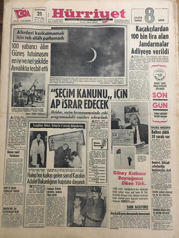 HÜRRİYET GAZETESİ 21 MAYIS 1966 YIL :19 SAYI :6485---100 yabancı alim güneş tutulmasını en iyi ve net şekilde Ayvalık ta tespit edildi ---Seçim Kanunu için AP israr edecek ---Kaçakçılardan 100 bin lira alan Jandarmalar adliyeye verildi ----Halep ten kalkıp gelen sarraf Karakin Adalet Adalet Bakanlığının kapısına dayandı ---Balkon çöktü 20 yaralı var ---Demirel iktisadi seferberliğe başlayacağız dedi ---İmar Yönetmeliği Tasdik İçin Ankara ya Götürüldü ---1777 de krala verilen bir kaplumbağa öldü ---Senelerden beri yatalak karısına hizmet ediyor ---Beşiktaş -Arsenal karşılaşıyor ---Sahanız hiç de öyle kötü değil --M.Ali Clay-Cooper bu gece dövüşecek-----Takımımız bugün Rusya ile oynuyor ---Zeki Müren ---Mecbur kalmadıkça soyunmayacağız ---Göksel Arsoy ,bir İngiliz kızı seçecek --, SEDAT SİMAVİ tarafından kaleme alınmıştır. Kitap 1966 yılında [HÜRRİYET MATBAA] yayınlanmıştır. 8 sayfadır. HÜRRİYET GAZETESİ 21 MAYIS 1966 YIL :19 SAYI :6485---100 yabancı alim güneş tutulmasını en iyi ve net şekilde Ayvalık ta tespit edildi ---Seçim Kanunu için AP israr edecek ---Kaçakçılardan 100 bin lira alan Jandarmalar adliyeye verildi ----Halep ten kalkıp gelen sarraf Karakin Adalet Adalet Bakanlığının kapısına dayandı ---Balkon çöktü 20 yaralı var ---Demirel iktisadi seferberliğe başlayacağız dedi ---İmar Yönetmeliği Tasdik İçin Ankara ya Götürüldü ---1777 de krala verilen bir kaplumbağa öldü ---Senelerden beri yatalak karısına hizmet ediyor ---Beşiktaş -Arsenal karşılaşıyor ---Sahanız hiç de öyle kötü değil --M.Ali Clay-Cooper bu gece dövüşecek-----Takımımız bugün Rusya ile oynuyor ---Zeki Müren ---Mecbur kalmadıkça soyunmayacağız ---Göksel Arsoy ,bir İngiliz kızı seçecek -- adlı eser Türkçe dilindedir.