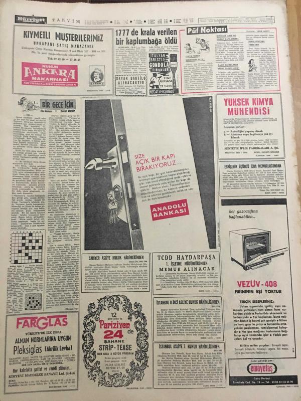 HÜRRİYET GAZETESİ 21 MAYIS 1966 YIL :19 SAYI :6485---100 yabancı alim güneş tutulmasını en iyi ve net şekilde Ayvalık ta tespit edildi ---Seçim Kanunu için AP israr edecek ---Kaçakçılardan 100 bin lira alan Jandarmalar adliyeye verildi ----Halep ten kalkıp gelen sarraf Karakin Adalet Adalet Bakanlığının kapısına dayandı ---Balkon çöktü 20 yaralı var ---Demirel iktisadi seferberliğe başlayacağız dedi ---İmar Yönetmeliği Tasdik İçin Ankara ya Götürüldü ---1777 de krala verilen bir kaplumbağa öldü ---Senelerden beri yatalak karısına hizmet ediyor ---Beşiktaş -Arsenal karşılaşıyor ---Sahanız hiç de öyle kötü değil --M.Ali Clay-Cooper bu gece dövüşecek-----Takımımız bugün Rusya ile oynuyor ---Zeki Müren ---Mecbur kalmadıkça soyunmayacağız ---Göksel Arsoy ,bir İngiliz kızı seçecek -- Yıpranma, sararmalar, kupon kesiği ve yırtılmalar zamana bağlı olarak görülebilir.