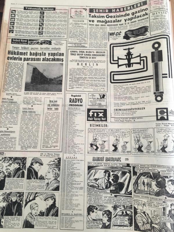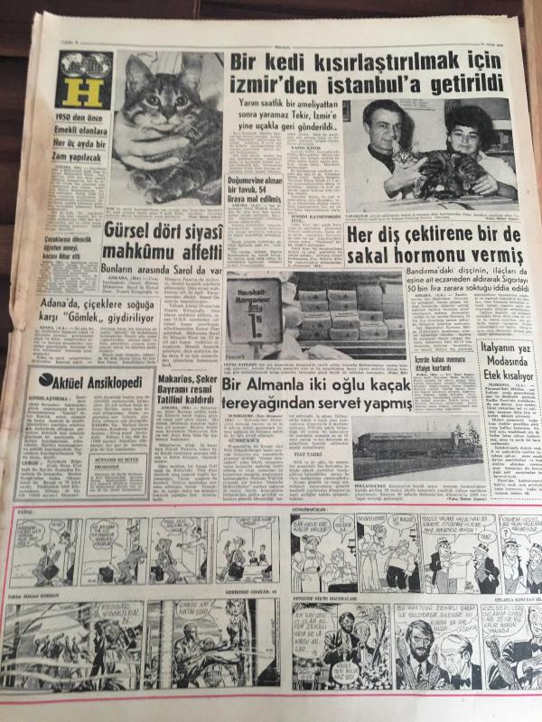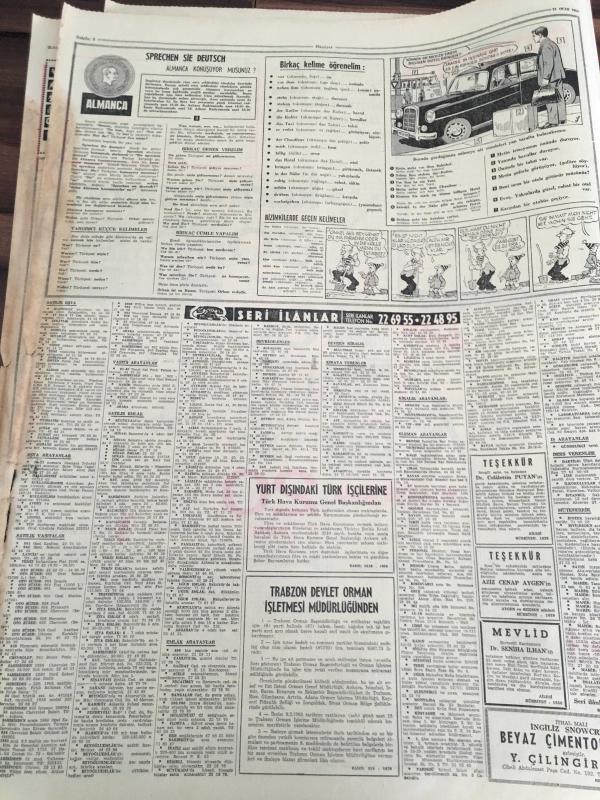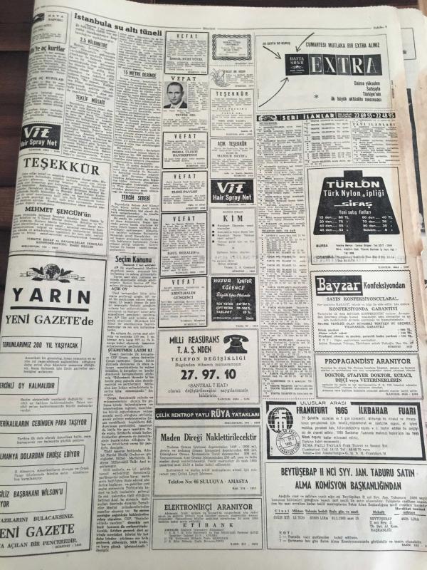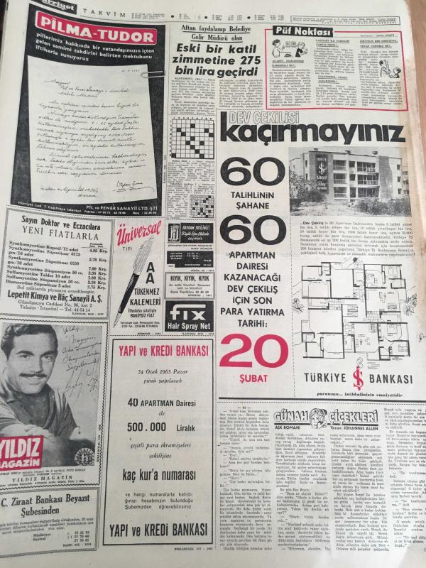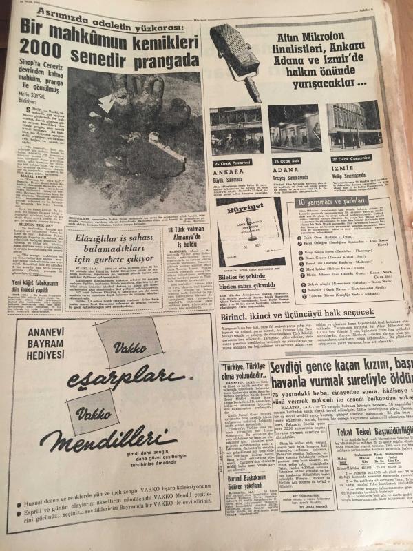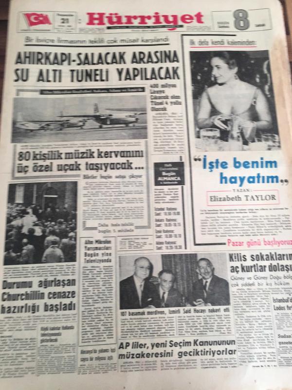 HÜRRİYET GAZETESİ 21 OCAK 1965 YIL :17 SAYI :6010----Ahır kapı -salacak arasına su altı tüneli yapılacak --80 kişilik müzik kervanını üç özel uçak taşıyacak ---Durumu ağırlaşan Churcillin cenaze hazırlığı --AP liler ,yeni seçim kanunun müzakeresini geciktiriyor ---Taksim Gezisinde gazino ve mağazalar yapılacak ---Asrımızda adaletin yüzkarası :Bir mahkumun kemikleri 2000 senedir prangada ---Elazığlılar iş sahası bulamadıkları için gurbete çıkıyor ---Sandro Puppo :Az farklı mağlubiyet bizim için başardılar ---- Gürsel dört siyasi mahkumu affetti ---1950 den önce emekli olanlara her üç ayda bir zam yapılacak -- Yıpranma, sararmalar, kupon kesiği ve yırtılmalar zamana bağlı olarak görülebilir.