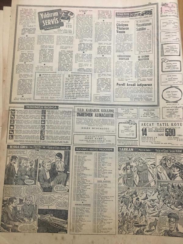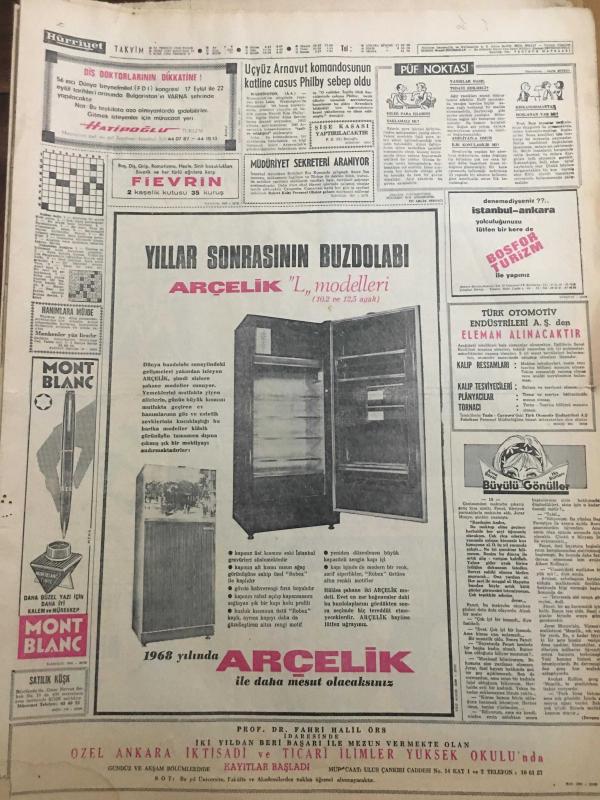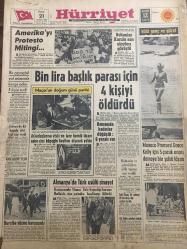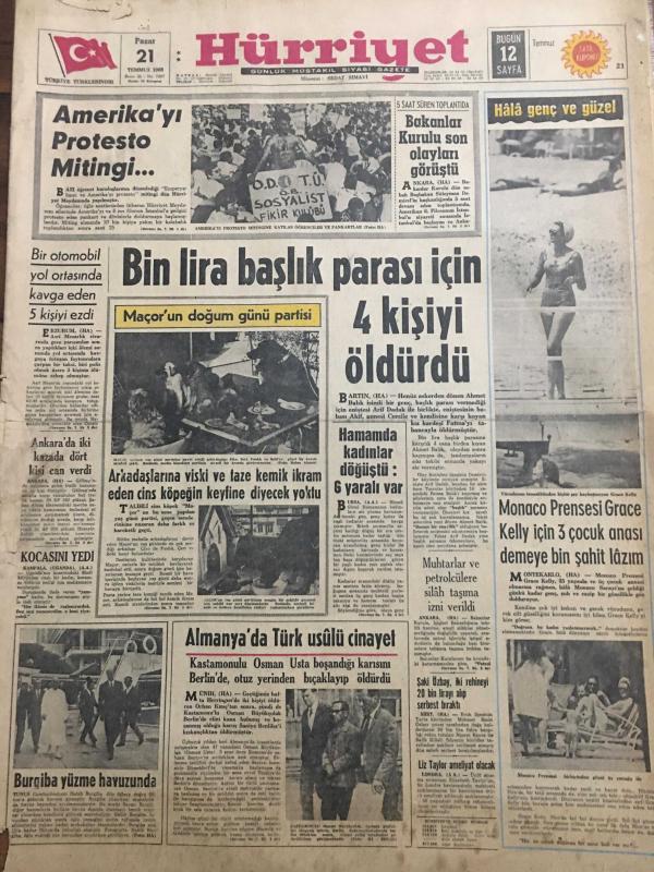 HÜRRİYET GAZETESİ 21 TEMMUZ 1968 YIL :21 SAYI :7267---Amerika yı Protesto Mitingi ---Bin lira başlık parası için 4 kişiyi öldürdü ---Bir otomobil yol ortasında kavga eden 5 kişiyi ezdi ---Arkadaşlarına viski ve taze kemik ikram eden cins köpeğin keyfine diyecek yoktu ---Hamam da kadınlar döğüştü 6 yaralı var ---Almanya da Türk usulü cinayet ---Manoca Prensesi Grace Kelly için 3 çocuk anası demeye bin şahit lazım ----İsveç te başlayan hastalık Avrupa yı tehdit ediyor ---Üç yüz Arnavut komandosunun katline casus Philby sebep oldu ----Diyarbakır da ısı gölgede 45 dereceye çıktı ---Beşiktaşlılar dikkat --Yüzmede 3 Türkiye Rekoru Yenilendi ---Ender ,Eskişehirspor dan ayrılmamak için kararlı ---Altay ın 2,5 milyonluk kadrosu ----Brezilya Takımı 40 Günde 106 Saat Uçtu ---Şaki Özbay iki rehineyi 20 bin liraya alıp serbest bıraktı ---Ankara da iki kazada dört kişi can verdi ---Muhtarlar ve petrolcülere silah taşıma izni verildi --Bakanlar Kurulu Son Olayları Görüştü -- Yıpranma, sararmalar, kupon kesiği ve yırtılmalar zamana bağlı olarak görülebilir.