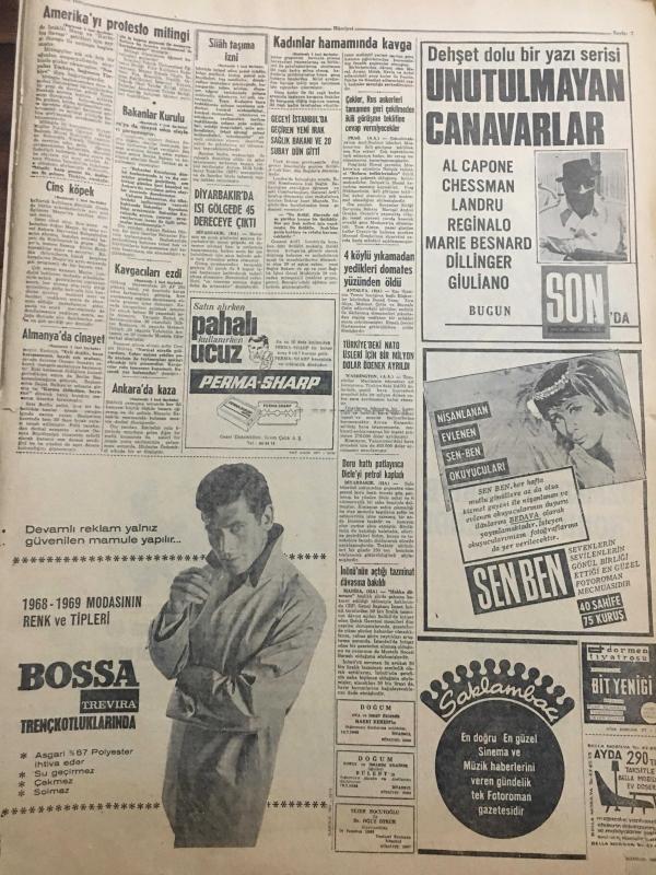 HÜRRİYET GAZETESİ 21 TEMMUZ 1968 YIL :21 SAYI :7267---Amerika yı Protesto Mitingi ---Bin lira başlık parası için 4 kişiyi öldürdü ---Bir otomobil yol ortasında kavga eden 5 kişiyi ezdi ---Arkadaşlarına viski ve taze kemik ikram eden cins köpeğin keyfine diyecek yoktu ---Hamam da kadınlar döğüştü 6 yaralı var ---Almanya da Türk usulü cinayet ---Manoca Prensesi Grace Kelly için 3 çocuk anası demeye bin şahit lazım ----İsveç te başlayan hastalık Avrupa yı tehdit ediyor ---Üç yüz Arnavut komandosunun katline casus Philby sebep oldu ----Diyarbakır da ısı gölgede 45 dereceye çıktı ---Beşiktaşlılar dikkat --Yüzmede 3 Türkiye Rekoru Yenilendi ---Ender ,Eskişehirspor dan ayrılmamak için kararlı ---Altay ın 2,5 milyonluk kadrosu ----Brezilya Takımı 40 Günde 106 Saat Uçtu ---Şaki Özbay iki rehineyi 20 bin liraya alıp serbest bıraktı ---Ankara da iki kazada dört kişi can verdi ---Muhtarlar ve petrolcülere silah taşıma izni verildi --Bakanlar Kurulu Son Olayları Görüştü --, SEDAT SİMAVİ tarafından kaleme alınmıştır. Kitap 1968 yılında [HÜRRİYET MATBAA] yayınlanmıştır. 12 sayfadır. HÜRRİYET GAZETESİ 21 TEMMUZ 1968 YIL :21 SAYI :7267---Amerika yı Protesto Mitingi ---Bin lira başlık parası için 4 kişiyi öldürdü ---Bir otomobil yol ortasında kavga eden 5 kişiyi ezdi ---Arkadaşlarına viski ve taze kemik ikram eden cins köpeğin keyfine diyecek yoktu ---Hamam da kadınlar döğüştü 6 yaralı var ---Almanya da Türk usulü cinayet ---Manoca Prensesi Grace Kelly için 3 çocuk anası demeye bin şahit lazım ----İsveç te başlayan hastalık Avrupa yı tehdit ediyor ---Üç yüz Arnavut komandosunun katline casus Philby sebep oldu ----Diyarbakır da ısı gölgede 45 dereceye çıktı ---Beşiktaşlılar dikkat --Yüzmede 3 Türkiye Rekoru Yenilendi ---Ender ,Eskişehirspor dan ayrılmamak için kararlı ---Altay ın 2,5 milyonluk kadrosu ----Brezilya Takımı 40 Günde 106 Saat Uçtu ---Şaki Özbay iki rehineyi 20 bin liraya alıp serbest bıraktı ---Ankara da iki kazada dört kişi can verdi ---Muhtarlar ve petrolcülere silah taşıma izni verildi --Bakanlar Kurulu Son Olayları Görüştü -- adlı eser Türkçe dilindedir.