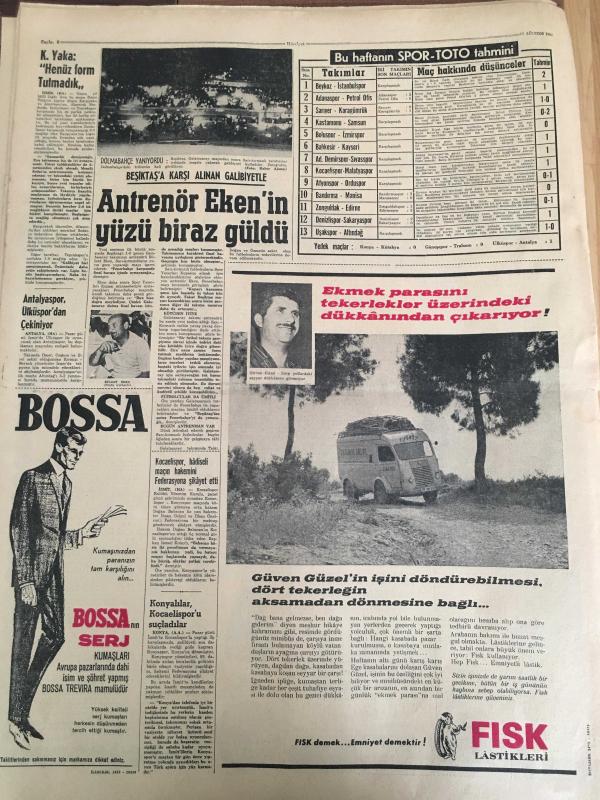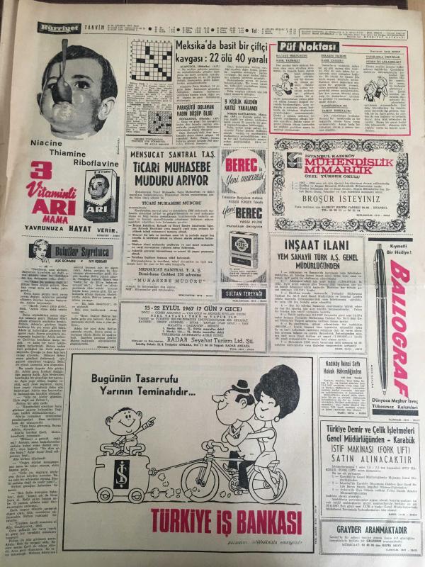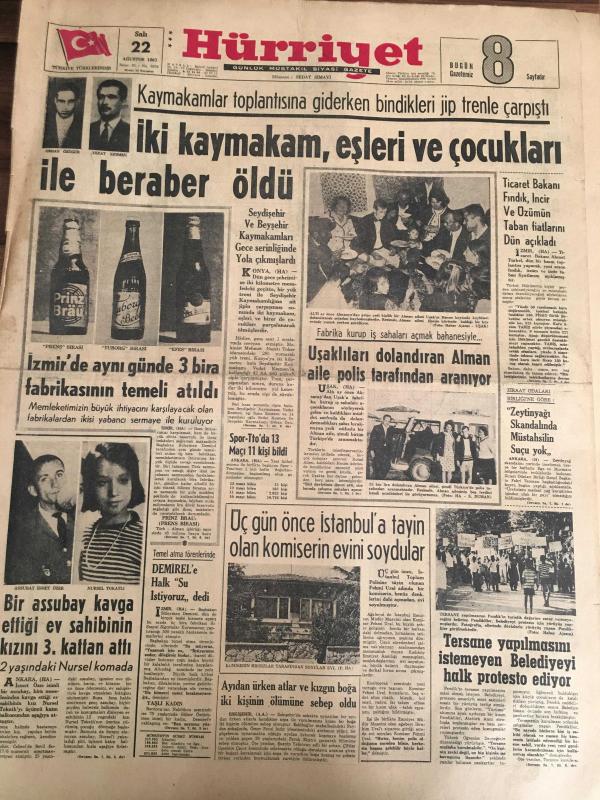 HÜRRİYET GAZETESİ 22 AĞUSTOS 1967 YIL :20 SAYI :6938---İki kaymakam ,eşleri ve çocukları ile beraber öldü --İzmir de aynı günde 3 bira fabrikasının temeli atıldı ---Uşaklıları dolandıran Alman aile polis tarafından aranıyor ---Üç gün önce İstanbul a tayin olan komiserin evini soydular ---Bir Assubay kavga ettiği ev sahibinin kızını 3. kattan attı ---Tersane yapılmasını istemeyen belediyeyi halk protesto ediyor ---Meksika da basit bir çiftçi kavgası :22 ölü 40 yaralı ---K.Yaka henüz form tutmadık ---Antrenör Eken in yüzü biraz güldü ---Kadın gangster nihayet yakalandı----Prenses Ira kocamın metresi ---Spor Tto da 13 Maçı 11 kişi bildi ---Ticaret Bakanı Fındık ,İncir ve üzümün taban fiyatlarını dün açıkladı ---Ayıdan ürken atlar ve kızgın boğa iki kişinin ölümüne sebep oldu -- Yıpranma, sararmalar, kupon kesiği ve yırtılmalar zamana bağlı olarak görülebilir.