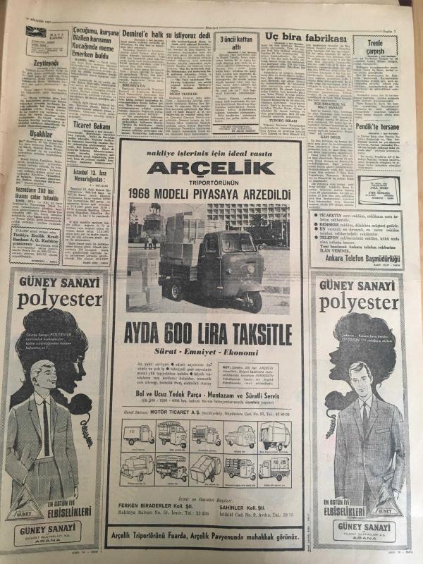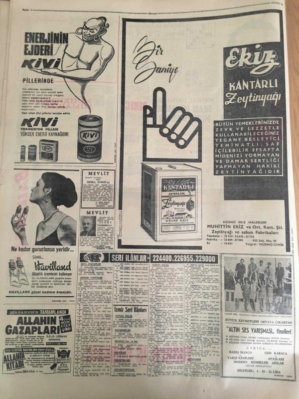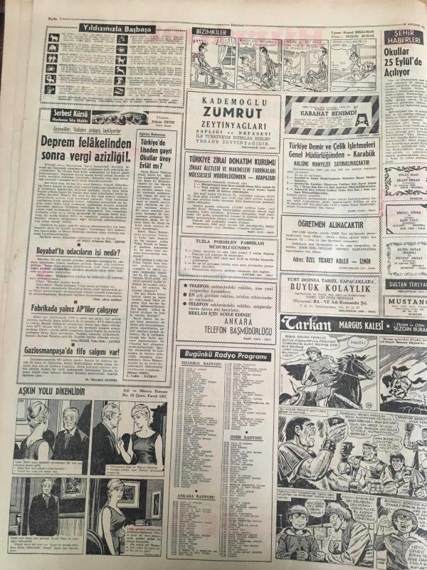 HÜRRİYET GAZETESİ 22 AĞUSTOS 1967 YIL :20 SAYI :6938---İki kaymakam ,eşleri ve çocukları ile beraber öldü --İzmir de aynı günde 3 bira fabrikasının temeli atıldı ---Uşaklıları dolandıran Alman aile polis tarafından aranıyor ---Üç gün önce İstanbul a tayin olan komiserin evini soydular ---Bir Assubay kavga ettiği ev sahibinin kızını 3. kattan attı ---Tersane yapılmasını istemeyen belediyeyi halk protesto ediyor ---Meksika da basit bir çiftçi kavgası :22 ölü 40 yaralı ---K.Yaka henüz form tutmadık ---Antrenör Eken in yüzü biraz güldü ---Kadın gangster nihayet yakalandı----Prenses Ira kocamın metresi ---Spor Tto da 13 Maçı 11 kişi bildi ---Ticaret Bakanı Fındık ,İncir ve üzümün taban fiyatlarını dün açıkladı ---Ayıdan ürken atlar ve kızgın boğa iki kişinin ölümüne sebep oldu --, SEDAT SİMAVİ tarafından kaleme alınmıştır. Kitap 1967 yılında [HÜRRİYET MATBAA] yayınlanmıştır. 8 sayfadır. HÜRRİYET GAZETESİ 22 AĞUSTOS 1967 YIL :20 SAYI :6938---İki kaymakam ,eşleri ve çocukları ile beraber öldü --İzmir de aynı günde 3 bira fabrikasının temeli atıldı ---Uşaklıları dolandıran Alman aile polis tarafından aranıyor ---Üç gün önce İstanbul a tayin olan komiserin evini soydular ---Bir Assubay kavga ettiği ev sahibinin kızını 3. kattan attı ---Tersane yapılmasını istemeyen belediyeyi halk protesto ediyor ---Meksika da basit bir çiftçi kavgası :22 ölü 40 yaralı ---K.Yaka henüz form tutmadık ---Antrenör Eken in yüzü biraz güldü ---Kadın gangster nihayet yakalandı----Prenses Ira kocamın metresi ---Spor Tto da 13 Maçı 11 kişi bildi ---Ticaret Bakanı Fındık ,İncir ve üzümün taban fiyatlarını dün açıkladı ---Ayıdan ürken atlar ve kızgın boğa iki kişinin ölümüne sebep oldu -- adlı eser Türkçe dilindedir.