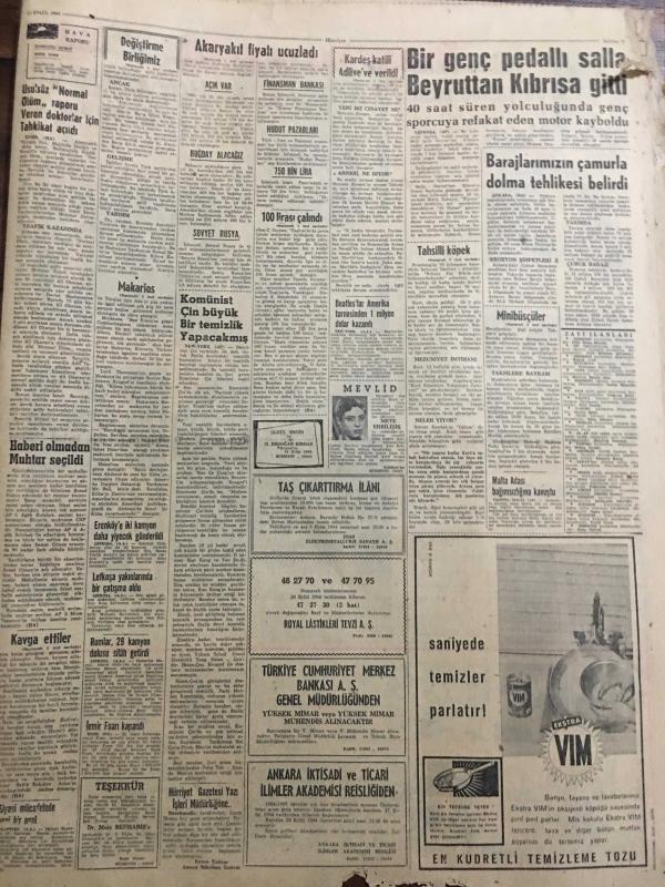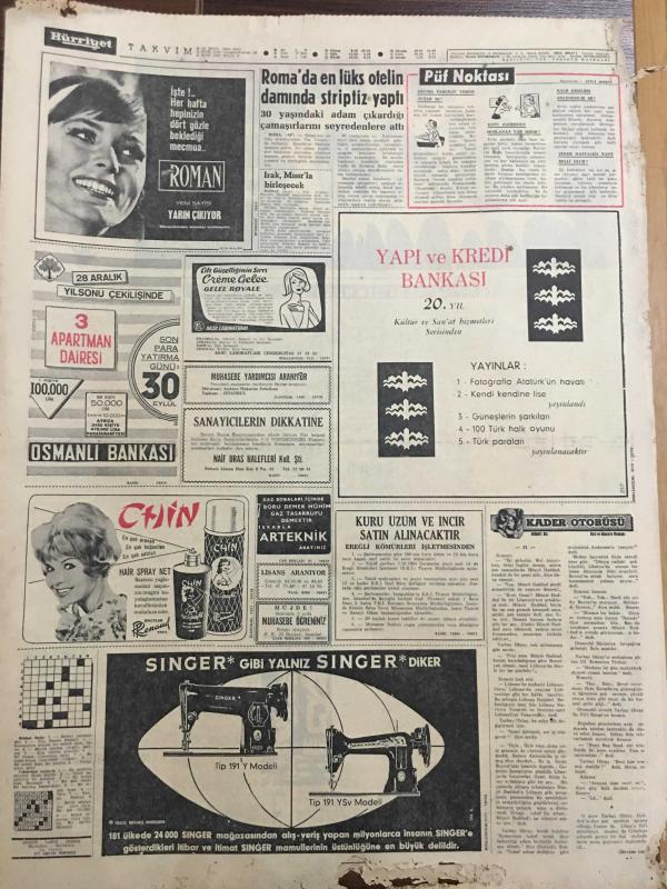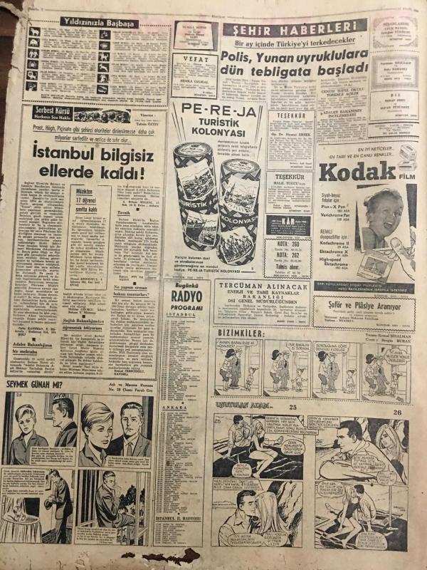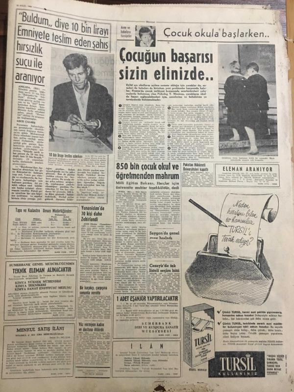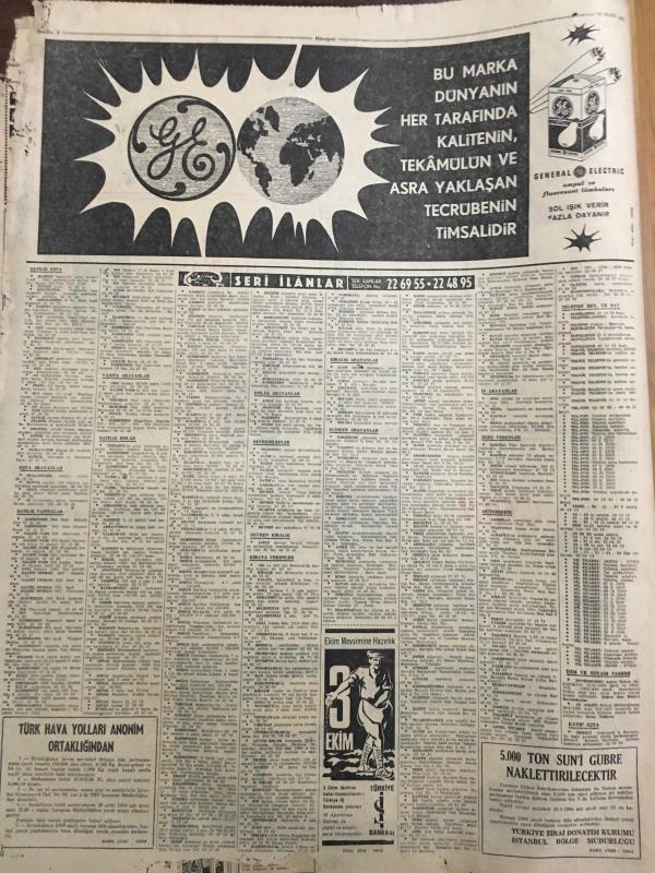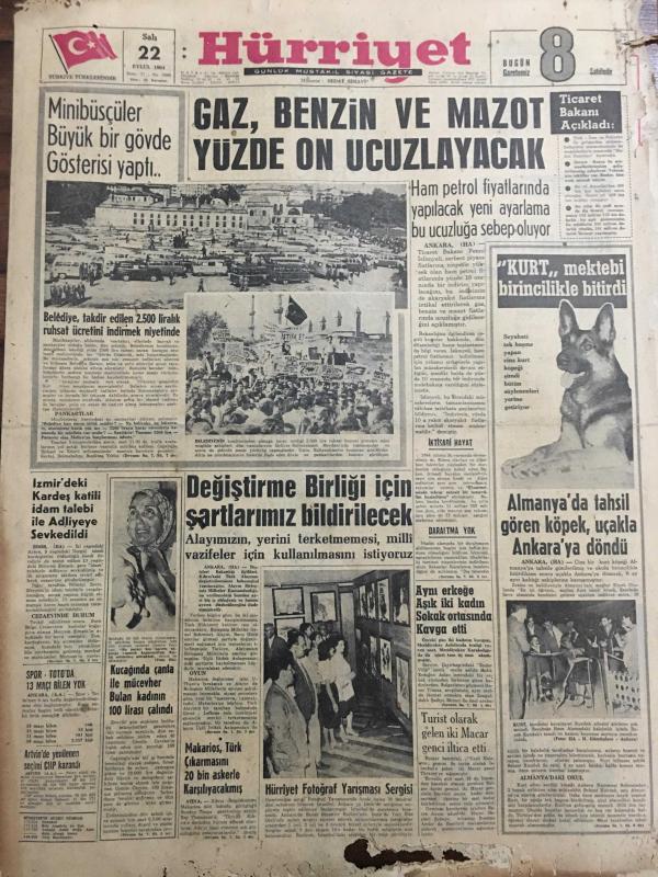 HÜRRİYET GAZETESİ 22 EYLÜL 1964 YIL :17 SAYI :5889--Gaz , benzin ve mazot yüzde on ucuzlayacak ---İzmir de ki kardeş katili idam talebi ile adliyeye sevk edildi ---Değiştirme Birliği için şartlarımız bildirilecek ---Kucağında çanta ile mücevher bulan kadının 100 lirası çalındı ---Almanya da tahsil gören köpek ,uçakla Ankara ya döndü ----Makarios ,Türk çıkarmasını 20 bin askerle karşılayacakmış ---Aynı erkeğe aşık olan kadın sokak ortasında kavga etti ---Polis ,Yunan uyruklara dün tebligata başladı ---Roma da en lüks otelin damında striptiz yaptı ---850 bin çocuk okul ve öğretmenden mahrum ---Gündüz Kılıç ,vazifeye çağrıldı ---Sakatlanacağını rüyasında görmüş ---Ankara dan dönen Beşiktaş şanssızlıktan dert yanıyor ---Milli Takım namzet kadrosu kampa girdi ---Beşiktaşlı Necmi ,mahkeme kararıyla yaşını küçülttü ---Sophia Loren 30 yaşına bastı ---Hayvanlarda Konuşuyor -- Yıpranma, sararmalar, kupon kesiği ve yırtılmalar zamana bağlı olarak görülebilir.