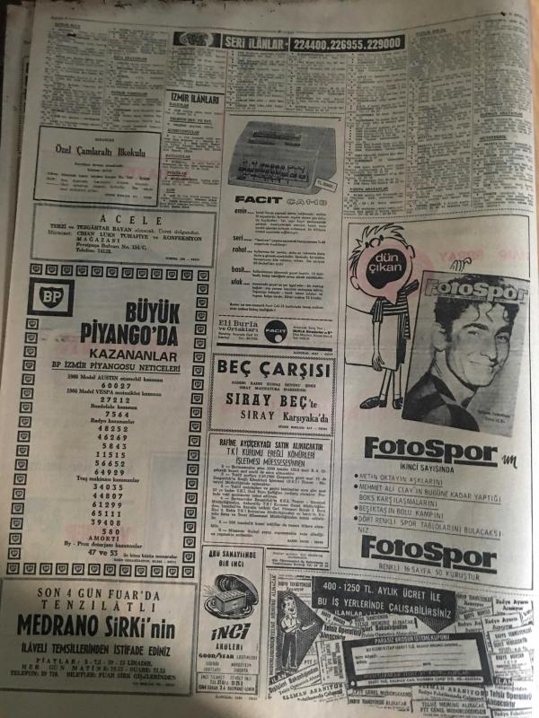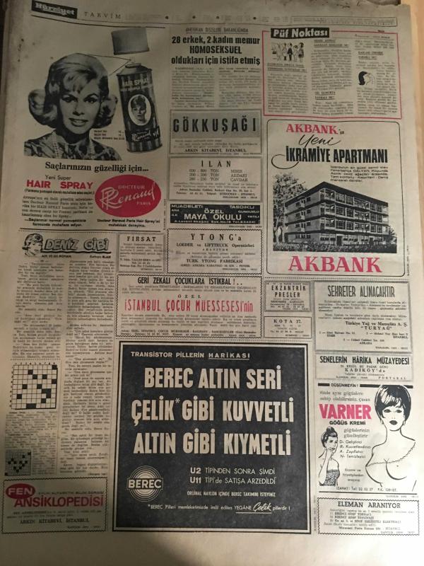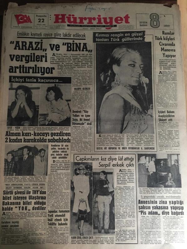 HÜRRİYET GAZETESİ 22 EYLÜL 1966 YIL :19 SAYI :6609---Arazi ve bina vergileri artırılıyor ---Alman karı -kocayı gezdiren 2 kadın karakolda sabahladı ---Siirtli şivesi ile THY dan bilet isteyen Ulaştırma Bakanına bilet olduğu halde yok dediler ---Rumlar Türk köyleri civarında manevra yapıyor ---İçişleri Bakanı Asayişsizlikten şikayet etti ----Çapkınların kız diye laf attığı Serpil erkek çıktı ---Annesinin zina yaptığı şahsın yakasına yapışıp pis adam diye bağırdı ---Japonlar ,tamamen yerli otomobil imal etmek için teklifte bulundu ---Tersanelerimizde 12 bin tondan büyük gemi inşa edilecek ---Galatasaray ,Beşiktaş ı yendi : 2-0--Radoviç ve Lemiç Fenerbahçe den ayrılmak istiyor --28 Erkek ,2 kadın memur HOMOSEKSÜEL oldukları için istifa etmiş ---Beylerbeyi n de 100 gece hayatı ---Demirel :Köy yolları ve içme suyu iki temel davamızdır dedi ---Kartalların kaçırdığı çocuklar parçalandı --- Yıpranma, sararmalar, kupon kesiği ve yırtılmalar zamana bağlı olarak görülebilir.