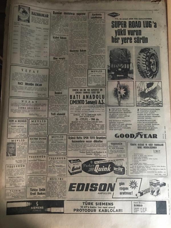 HÜRRİYET GAZETESİ 22 EYLÜL 1966 YIL :19 SAYI :6609---Arazi ve bina vergileri artırılıyor ---Alman karı -kocayı gezdiren 2 kadın karakolda sabahladı ---Siirtli şivesi ile THY dan bilet isteyen Ulaştırma Bakanına bilet olduğu halde yok dediler ---Rumlar Türk köyleri civarında manevra yapıyor ---İçişleri Bakanı Asayişsizlikten şikayet etti ----Çapkınların kız diye laf attığı Serpil erkek çıktı ---Annesinin zina yaptığı şahsın yakasına yapışıp pis adam diye bağırdı ---Japonlar ,tamamen yerli otomobil imal etmek için teklifte bulundu ---Tersanelerimizde 12 bin tondan büyük gemi inşa edilecek ---Galatasaray ,Beşiktaş ı yendi : 2-0--Radoviç ve Lemiç Fenerbahçe den ayrılmak istiyor --28 Erkek ,2 kadın memur HOMOSEKSÜEL oldukları için istifa etmiş ---Beylerbeyi n de 100 gece hayatı ---Demirel :Köy yolları ve içme suyu iki temel davamızdır dedi ---Kartalların kaçırdığı çocuklar parçalandı ---, SEDAT SİMAVİ tarafından kaleme alınmıştır. Kitap 1966 yılında [HÜRRİYET MATBAA] yayınlanmıştır. 8 sayfadır. HÜRRİYET GAZETESİ 22 EYLÜL 1966 YIL :19 SAYI :6609---Arazi ve bina vergileri artırılıyor ---Alman karı -kocayı gezdiren 2 kadın karakolda sabahladı ---Siirtli şivesi ile THY dan bilet isteyen Ulaştırma Bakanına bilet olduğu halde yok dediler ---Rumlar Türk köyleri civarında manevra yapıyor ---İçişleri Bakanı Asayişsizlikten şikayet etti ----Çapkınların kız diye laf attığı Serpil erkek çıktı ---Annesinin zina yaptığı şahsın yakasına yapışıp pis adam diye bağırdı ---Japonlar ,tamamen yerli otomobil imal etmek için teklifte bulundu ---Tersanelerimizde 12 bin tondan büyük gemi inşa edilecek ---Galatasaray ,Beşiktaş ı yendi : 2-0--Radoviç ve Lemiç Fenerbahçe den ayrılmak istiyor --28 Erkek ,2 kadın memur HOMOSEKSÜEL oldukları için istifa etmiş ---Beylerbeyi n de 100 gece hayatı ---Demirel :Köy yolları ve içme suyu iki temel davamızdır dedi ---Kartalların kaçırdığı çocuklar parçalandı --- adlı eser Türkçe dilindedir.