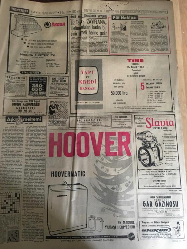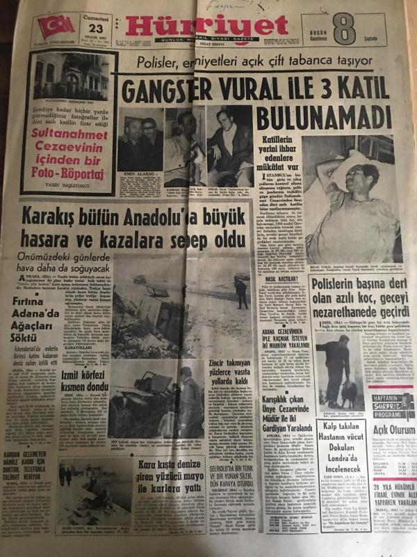 HÜRRİYET GAZETESİ 23 ARALIK 1967 YIL :20 SAYI :7061--Gangster Vural ile 3 Katil Bulunamadı --Karakış bütün Anadolu da büyük hasara ve kazalara sebep oldu --Fırtına Adana da Ağaçlar Söktü ---İzmit körfezi kısmen dondu ---Polislerin başına dert olan azılı koç ,geceyi nezarethane de geçirdi ---Karışıklık çıkan Ünye ve cezaevinde müdür ile iki gardiyan yaralandı ---Liz Taylor :Zayıflama iletine tutulan kadın bir sinir demeti haline geldi ---Fenerbahçe lig liderliğini bırakmayacak --Galatasaray ve Fenerbahçe Ankara da---Sahalar maçlara yetiştirilmek için temizleniyor --Osman Kibar İz.Spor a 10 Bin Lira Bağışladı ---Perukalı çete reisi dört yıl sonra ele geçti --Otobüs -Tren de Ne Makinist Ne de Şoför Var --- Yıpranma, sararmalar, kupon kesiği ve yırtılmalar zamana bağlı olarak görülebilir.