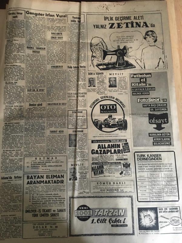 HÜRRİYET GAZETESİ 23 ARALIK 1967 YIL :20 SAYI :7061--Gangster Vural ile 3 Katil Bulunamadı --Karakış bütün Anadolu da büyük hasara ve kazalara sebep oldu --Fırtına Adana da Ağaçlar Söktü ---İzmit körfezi kısmen dondu ---Polislerin başına dert olan azılı koç ,geceyi nezarethane de geçirdi ---Karışıklık çıkan Ünye ve cezaevinde müdür ile iki gardiyan yaralandı ---Liz Taylor :Zayıflama iletine tutulan kadın bir sinir demeti haline geldi ---Fenerbahçe lig liderliğini bırakmayacak --Galatasaray ve Fenerbahçe Ankara da---Sahalar maçlara yetiştirilmek için temizleniyor --Osman Kibar İz.Spor a 10 Bin Lira Bağışladı ---Perukalı çete reisi dört yıl sonra ele geçti --Otobüs -Tren de Ne Makinist Ne de Şoför Var ---, SEDAT SİMAVİ tarafından kaleme alınmıştır. Kitap 1967 yılında [HÜRRİYET MATBAA] yayınlanmıştır. 8 sayfadır. HÜRRİYET GAZETESİ 23 ARALIK 1967 YIL :20 SAYI :7061--Gangster Vural ile 3 Katil Bulunamadı --Karakış bütün Anadolu da büyük hasara ve kazalara sebep oldu --Fırtına Adana da Ağaçlar Söktü ---İzmit körfezi kısmen dondu ---Polislerin başına dert olan azılı koç ,geceyi nezarethane de geçirdi ---Karışıklık çıkan Ünye ve cezaevinde müdür ile iki gardiyan yaralandı ---Liz Taylor :Zayıflama iletine tutulan kadın bir sinir demeti haline geldi ---Fenerbahçe lig liderliğini bırakmayacak --Galatasaray ve Fenerbahçe Ankara da---Sahalar maçlara yetiştirilmek için temizleniyor --Osman Kibar İz.Spor a 10 Bin Lira Bağışladı ---Perukalı çete reisi dört yıl sonra ele geçti --Otobüs -Tren de Ne Makinist Ne de Şoför Var --- adlı eser Türkçe dilindedir.