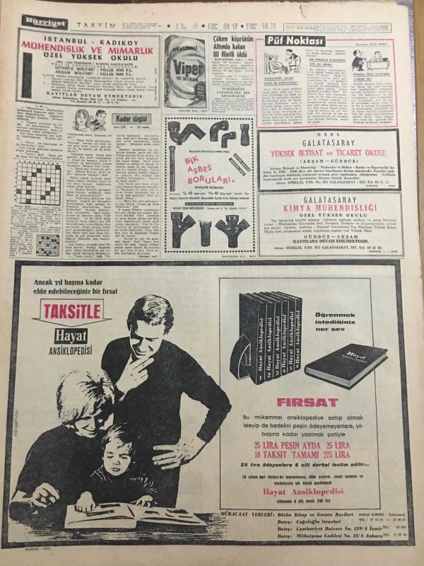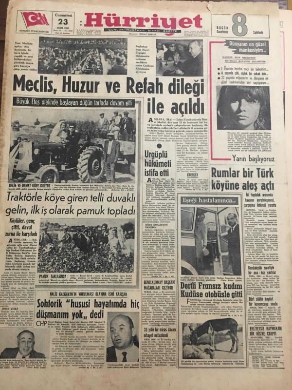 HÜRRİYET GAZETESİ 23 EKİM 1965 YIL :18 SAYI :6280--Meclis ,Huzur ve Refah Dileği ile Açıldı ---Ürgüplü Hükümeti İstifa Etti --Traktörle köye giren telli duvaklı gelin ,ilk iş olarak pamuk topladı ---Sohtorik hususi hayatımda hiç düşmanım yok dedi---Rumlar bir Türk köyüne ateş açtı ---Dertli Fransız kadını Kudüs e otobüsle gitti ---Kurbağalıdere nin kokusu ve pisliği yakında gideriliyor ----Çöken köprünün altında kalan 80 Hintli öldü ---Türkiye -Romanya --Ümitler maçı yarın --Mikrofondan Perdeye : Ajda Pekkan ,Tanju Okan ,Semra Sar , Yıldırım Gürses Muhterem Nur ,Vasfi Uçaroğlu ,Gönül Yazar ----Günşiray ,Kanlı maydan la beyaz perdeye döndü ---Sinema da Fotojeni ---Genelkurmay Başkanı Mağaraları Geziyor ---33 Yılık Bir Miras Davası Nihayet Neticelendi ---Ehliyetsiz Kaymakam Bir Kişiyi Çarptı --- Yıpranma, sararmalar, kupon kesiği ve yırtılmalar zamana bağlı olarak görülebilir.