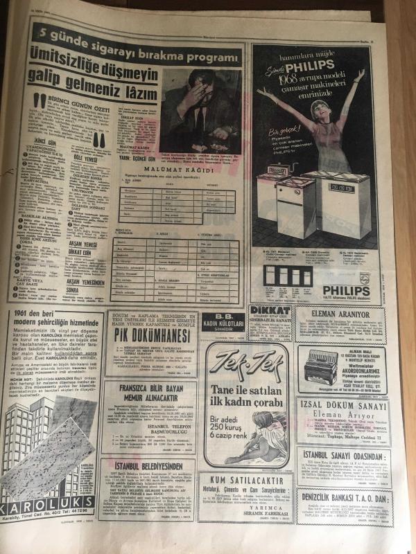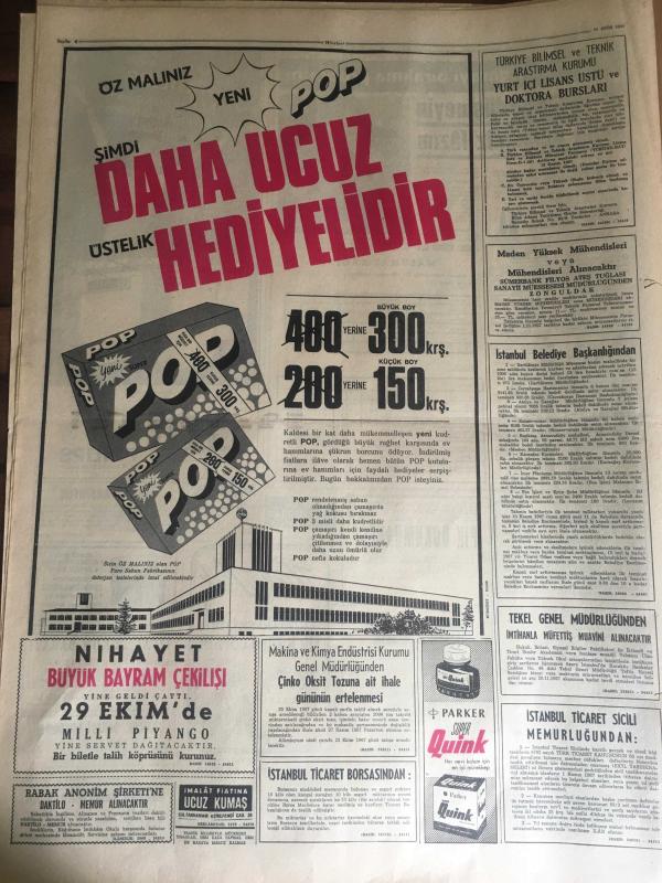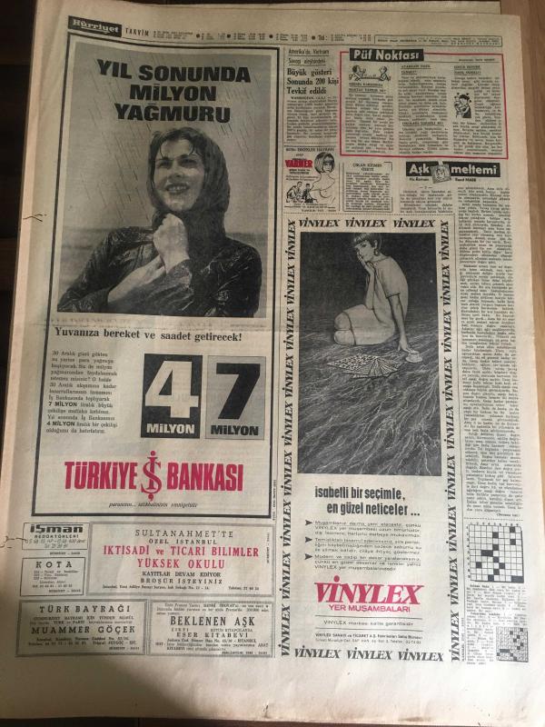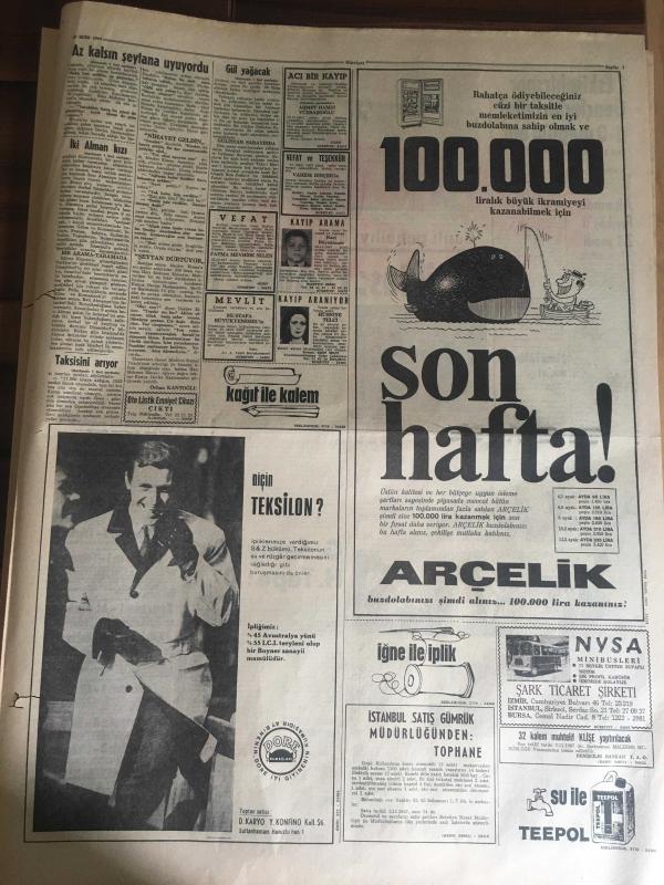 HÜRRİYET GAZETESİ 23 EKİM 1967 YIL :20 SAYI :7000--Mısır da emlaki olan Türkler tazminat alacak --Irak a çamaşır makinesi ve buzdolabı satacağız ---Mısır bir İsrail Muhribini Batırdı ,150 ölü ve yaralı var ---Pasaportsuz iki Alman kızı hudut dışı edildi ---Sokak sokak dolaşıp duvarlara ilan asıyor ---Tören günü Tahran a havadan gül yağacak ---Necdet Elmas üçüncü izin günü annesi ve babasıyla beraber geçirdi ----Büyük gösteri sonunda 200 kişi tevkif edildi ---5 Günde Sigarayı Bırakma Programı --Eskişehirspor Gençlerbirliğini 1-0 mağlup etti --Altınordu Feriköy ü 2-1 yendi-----Beşiktaş :1 Altay :1 ---Galatasaray :0 H.Tepe : 0--Türkiye Atletizm Şampiyonası ---Polislere 17 kilo baz morfin satmak isterken yakalandılar ---İstanbullu fabrikatörün oğlu itirafta bulundu teyzemi ben öldürdüm ---Bir Tüccar ve eşi banyo da ölü bulundu ---Kadıköy Üsküdar yolu asfaltlanıyor ---Radyo Programları ---Türkiye İş Bankası :47 Milyon --3.Türkiye Ligi Maçları --, SEDAT SİMAVİ tarafından kaleme alınmıştır. Kitap 1967 yılında [HÜRRİYET MATBAA] yayınlanmıştır. 8 sayfadır. HÜRRİYET GAZETESİ 23 EKİM 1967 YIL :20 SAYI :7000--Mısır da emlaki olan Türkler tazminat alacak --Irak a çamaşır makinesi ve buzdolabı satacağız ---Mısır bir İsrail Muhribini Batırdı ,150 ölü ve yaralı var ---Pasaportsuz iki Alman kızı hudut dışı edildi ---Sokak sokak dolaşıp duvarlara ilan asıyor ---Tören günü Tahran a havadan gül yağacak ---Necdet Elmas üçüncü izin günü annesi ve babasıyla beraber geçirdi ----Büyük gösteri sonunda 200 kişi tevkif edildi ---5 Günde Sigarayı Bırakma Programı --Eskişehirspor Gençlerbirliğini 1-0 mağlup etti --Altınordu Feriköy ü 2-1 yendi-----Beşiktaş :1 Altay :1 ---Galatasaray :0 H.Tepe : 0--Türkiye Atletizm Şampiyonası ---Polislere 17 kilo baz morfin satmak isterken yakalandılar ---İstanbullu fabrikatörün oğlu itirafta bulundu teyzemi ben öldürdüm ---Bir Tüccar ve eşi banyo da ölü bulundu ---Kadıköy Üsküdar yolu asfaltlanıyor ---Radyo Programları ---Türkiye İş Bankası :47 Milyon --3.Türkiye Ligi Maçları -- adlı eser Türkçe dilindedir.