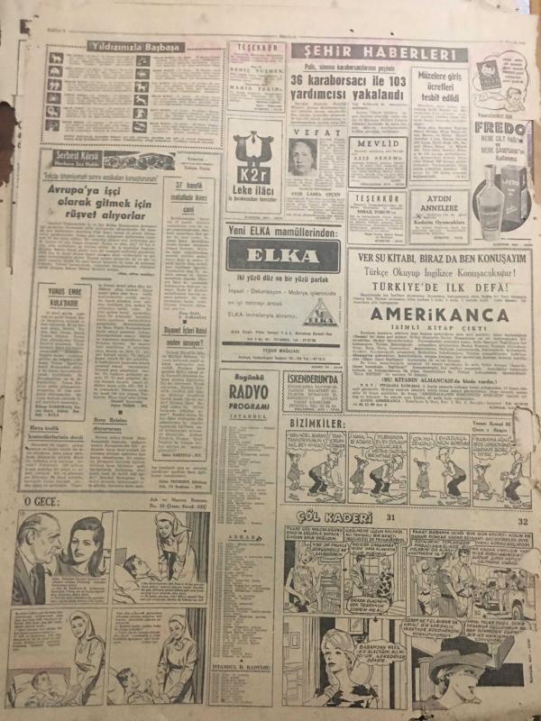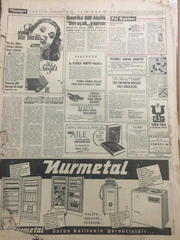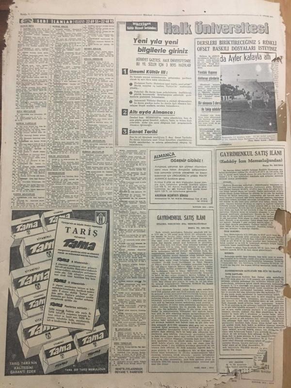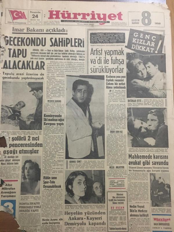 HÜRRİYET GAZETESİ 24 ARALIK 1964 YIL :17 SAYI :1964 ---İmar Bakanı Açıkladı :Gecekondu sahipleri tapu alacak --Artist yapmak için va di ile fuhşa sürüklüyorlar --Komisyonda iki mebus ağız kavgası yaptı ---Şoförü 2. penceresinden aşağı atmışlar ---Mahkemede karısını avukat gibi savundu --Heyelan yüzünden Ankara -Kayseri Demiryolu kapandı ---36 karaborsacı ile 103 yardımcısı yakalandı ---Amerika 600 kişilik dev uçak yapıyor ---Sofya Karması ,İzmir i mağlup edemedi :1-1---Ali Sami Yen Stadının İsmi Değiştirilecek ---R. Karaduman Milli Takımdan Daha İyi Futbol Oynadık Dedi ---Bağcılar Başşehre dört puan için gidiyoruz dedi ---Yılın futbolcusu :Denis law ----Artist ajanın cep telefonundan ---Konya İtfaiye Personeli Yerli Arazöz Yaptı ---Nedim Veysel İlkin Merkeze Alınması Katileşti --- Yıpranma, sararmalar, kupon kesiği ve yırtılmalar zamana bağlı olarak görülebilir.
