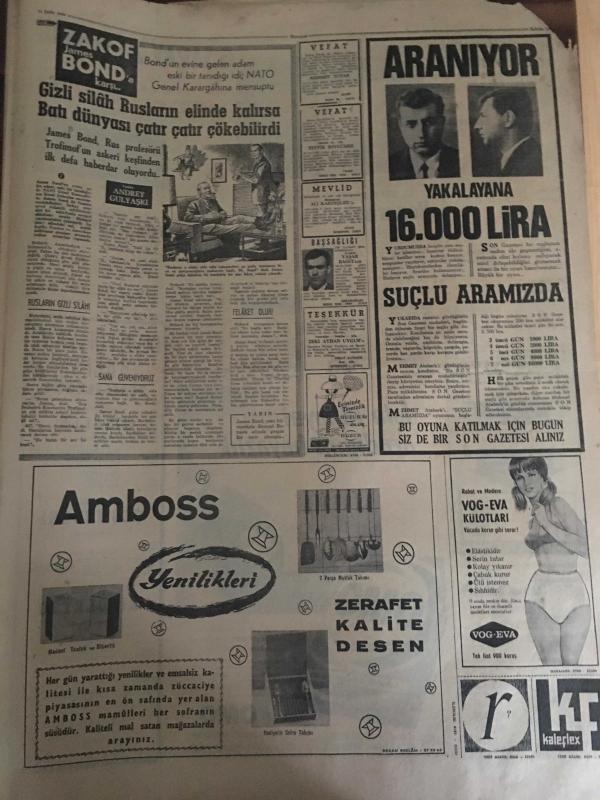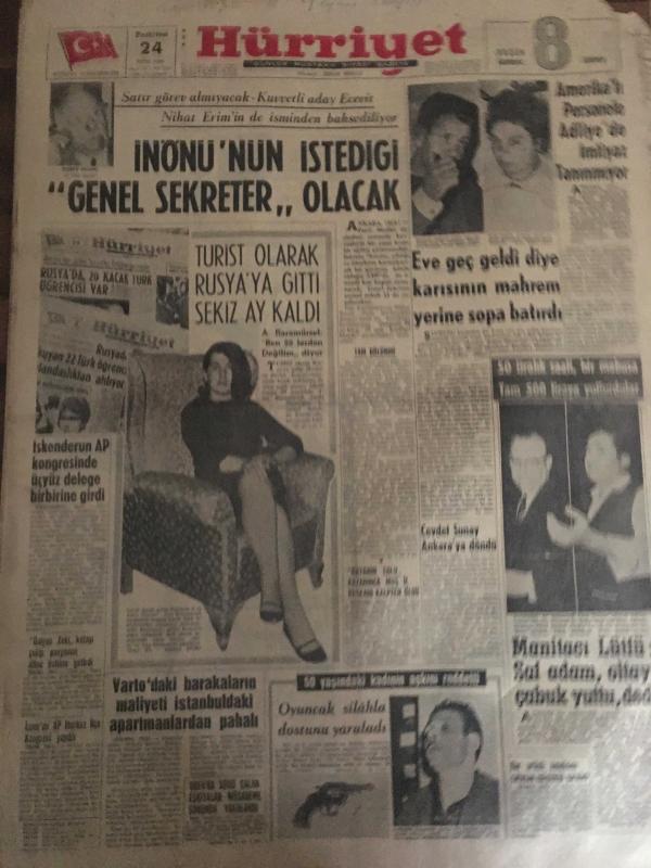 HÜRRİYET GAZETESİ 24 EKİM 1966 YIL :19 SAYI :6641---İnönü nün istediği genel sekreter olacak ---Turist olarak Rusya ya gitti sekiz ay kaldı ---İskenderun AP kongresinde üç yüz delege birbirine girdi ---Eve geç geldi diye karısının mahrem yerine sopa batırdı ---Amerikalı Personele Adliye de İmtiyaz Tanınmıyor ---Varto da ki barakaların maliyeti İstanbul da ki apartmanlardan pahalı ---Manitacı Lütfü :Saf adam ,oltayı çabuk yuttu dedi --Sarıyer deresinin üstü kapatılacak turistik lokantalar yapılacak ---Gezegenlerde ,çimen ağaç ve insan varmış ---Altay -Hacettepe yenişemediler 0-0---G.Birliği :1 Karşıyaka :0---Fenerbahçe 1-0 galip ---Galatasaray 2-1 yenildi ---Vefa ,ilk puanını aldı ---Evimde ikinci planda kalmak isterim --Cevdet Sunay Ankara ya döndü ---Ortanın solu kazanınca Muş İl Başkanı kalpten öldü --Oyuncak silahla dostunu yaraladı --Urfa da sürü çalan eşkiyalar müsademe sonunda yakalandı --, SEDAT SİMAVİ tarafından kaleme alınmıştır. Kitap 1966 yılında [HÜRRİYET MATBAA] yayınlanmıştır. 8 sayfadır. HÜRRİYET GAZETESİ 24 EKİM 1966 YIL :19 SAYI :6641---İnönü nün istediği genel sekreter olacak ---Turist olarak Rusya ya gitti sekiz ay kaldı ---İskenderun AP kongresinde üç yüz delege birbirine girdi ---Eve geç geldi diye karısının mahrem yerine sopa batırdı ---Amerikalı Personele Adliye de İmtiyaz Tanınmıyor ---Varto da ki barakaların maliyeti İstanbul da ki apartmanlardan pahalı ---Manitacı Lütfü :Saf adam ,oltayı çabuk yuttu dedi --Sarıyer deresinin üstü kapatılacak turistik lokantalar yapılacak ---Gezegenlerde ,çimen ağaç ve insan varmış ---Altay -Hacettepe yenişemediler 0-0---G.Birliği :1 Karşıyaka :0---Fenerbahçe 1-0 galip ---Galatasaray 2-1 yenildi ---Vefa ,ilk puanını aldı ---Evimde ikinci planda kalmak isterim --Cevdet Sunay Ankara ya döndü ---Ortanın solu kazanınca Muş İl Başkanı kalpten öldü --Oyuncak silahla dostunu yaraladı --Urfa da sürü çalan eşkiyalar müsademe sonunda yakalandı -- adlı eser Türkçe dilindedir.
