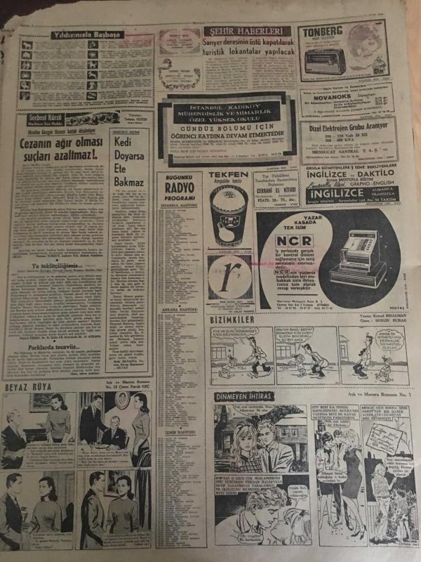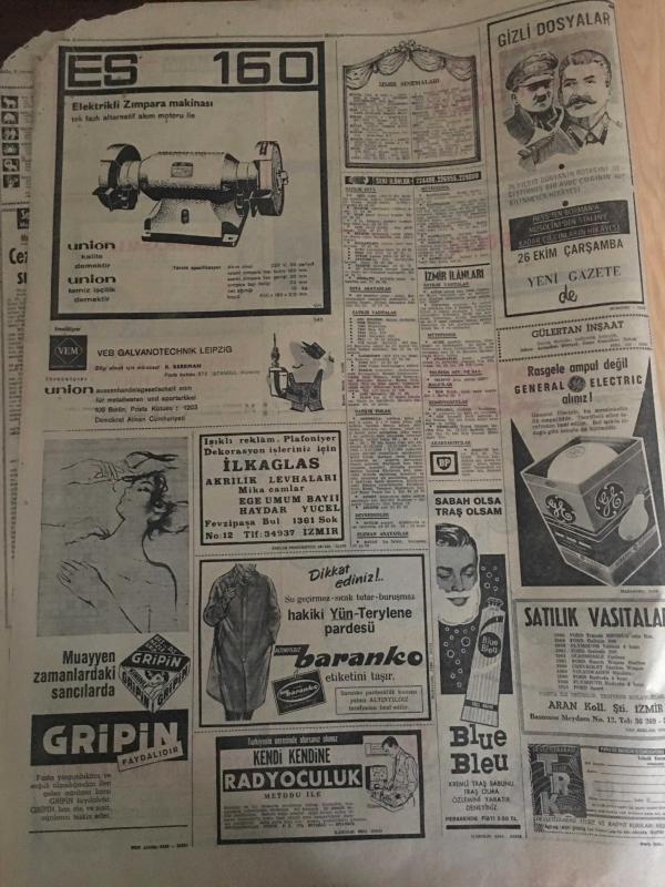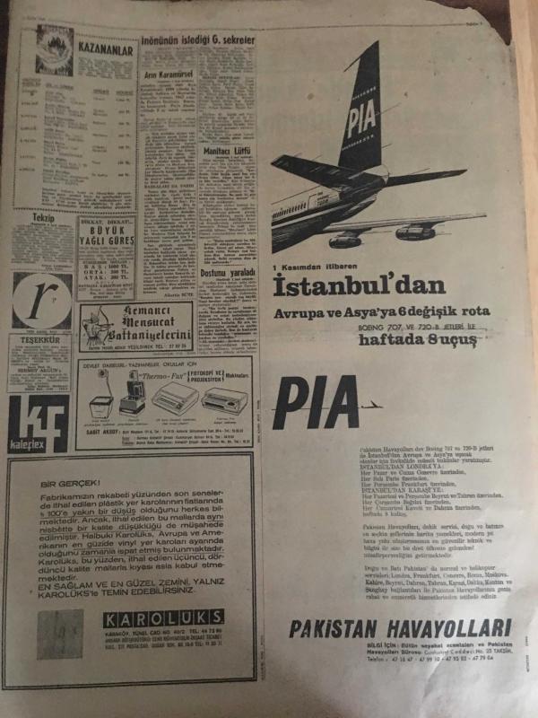HÜRRİYET GAZETESİ 24 EKİM 1966 YIL :19 SAYI :6641---İnönü nün istediği genel sekreter olacak ---Turist olarak Rusya ya gitti sekiz ay kaldı ---İskenderun AP kongresinde üç yüz delege birbirine girdi ---Eve geç geldi diye karısının mahrem yerine sopa batırdı ---Amerikalı Personele Adliye de İmtiyaz Tanınmıyor ---Varto da ki barakaların maliyeti İstanbul da ki apartmanlardan pahalı ---Manitacı Lütfü :Saf adam ,oltayı çabuk yuttu dedi --Sarıyer deresinin üstü kapatılacak turistik lokantalar yapılacak ---Gezegenlerde ,çimen ağaç ve insan varmış ---Altay -Hacettepe yenişemediler 0-0---G.Birliği :1 Karşıyaka :0---Fenerbahçe 1-0 galip ---Galatasaray 2-1 yenildi ---Vefa ,ilk puanını aldı ---Evimde ikinci planda kalmak isterim --Cevdet Sunay Ankara ya döndü ---Ortanın solu kazanınca Muş İl Başkanı kalpten öldü --Oyuncak silahla dostunu yaraladı --Urfa da sürü çalan eşkiyalar müsademe sonunda yakalandı -- Yıpranma, sararmalar, kupon kesiği ve yırtılmalar zamana bağlı olarak görülebilir.
