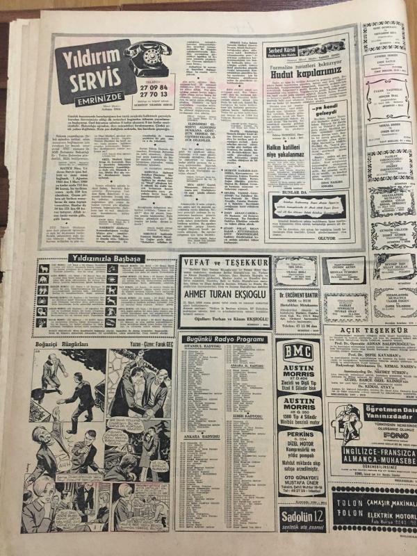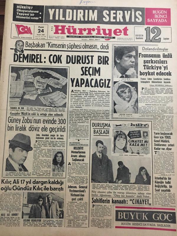 HÜRRİYET GAZETESİ 24 MART 1968 YIL :20 SAYI :7148--Demirel :Çok dürüst bir seçim yapacağız ---Güney Zobu 'nun evinde 300 bin liralık döviz ele geçirildi ---Kılıç Ali 17 yıl dargın kaldığı oğlu Gündüz Kılıç ile barıştı ---Fransa nın ünlü şarkıcıları Türkiye yi boykot edecek ---Belediye Memurlarının Avans Alması Sağlanacak ---Johnson ,General Vestmoreland 'ı Vietnam dan Geri Çekti --Yarın başlayacak grev için Tekel Genel Müdürü ,Stoklarımız Yeteri Kadar Var ,Diyor ---İstanbul da bir köpeğin kalbi değiştirilip bir saat yaşatıldı --İngiltere Başbakanı Kendisini Yuhalayanlara Nasihat Etti --Şekerspor oynadı Göztepe kazandı :1-0---Can lı Fenerbahçe G.Birliği Karşısında ---Mersin İ.Yurdu A.Gücü nü devirdi :1-0---Feriköy 'ün kurtulma şansı günden güne azalıyor ---Balkan Kros Şampiyonası Bugün Yapılıyor ---, SEDAT SİMAVİ tarafından kaleme alınmıştır. Kitap 1968 yılında [HÜRRİYET MATBAA] yayınlanmıştır. 12 sayfadır. HÜRRİYET GAZETESİ 24 MART 1968 YIL :20 SAYI :7148--Demirel :Çok dürüst bir seçim yapacağız ---Güney Zobu 'nun evinde 300 bin liralık döviz ele geçirildi ---Kılıç Ali 17 yıl dargın kaldığı oğlu Gündüz Kılıç ile barıştı ---Fransa nın ünlü şarkıcıları Türkiye yi boykot edecek ---Belediye Memurlarının Avans Alması Sağlanacak ---Johnson ,General Vestmoreland 'ı Vietnam dan Geri Çekti --Yarın başlayacak grev için Tekel Genel Müdürü ,Stoklarımız Yeteri Kadar Var ,Diyor ---İstanbul da bir köpeğin kalbi değiştirilip bir saat yaşatıldı --İngiltere Başbakanı Kendisini Yuhalayanlara Nasihat Etti --Şekerspor oynadı Göztepe kazandı :1-0---Can lı Fenerbahçe G.Birliği Karşısında ---Mersin İ.Yurdu A.Gücü nü devirdi :1-0---Feriköy 'ün kurtulma şansı günden güne azalıyor ---Balkan Kros Şampiyonası Bugün Yapılıyor --- adlı eser Türkçe dilindedir.