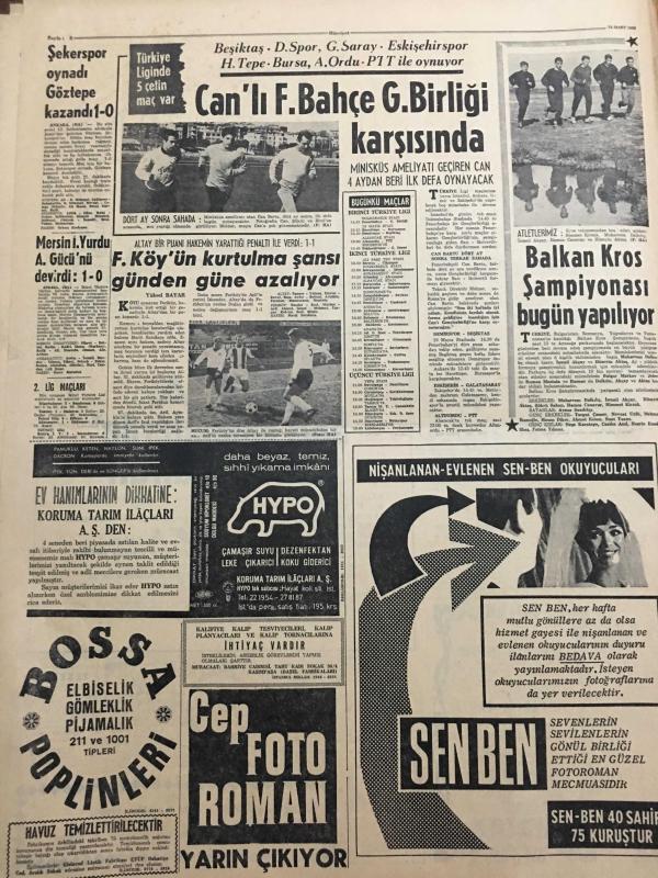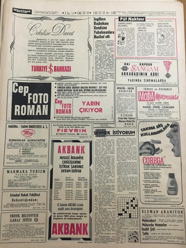 HÜRRİYET GAZETESİ 24 MART 1968 YIL :20 SAYI :7148--Demirel :Çok dürüst bir seçim yapacağız ---Güney Zobu 'nun evinde 300 bin liralık döviz ele geçirildi ---Kılıç Ali 17 yıl dargın kaldığı oğlu Gündüz Kılıç ile barıştı ---Fransa nın ünlü şarkıcıları Türkiye yi boykot edecek ---Belediye Memurlarının Avans Alması Sağlanacak ---Johnson ,General Vestmoreland 'ı Vietnam dan Geri Çekti --Yarın başlayacak grev için Tekel Genel Müdürü ,Stoklarımız Yeteri Kadar Var ,Diyor ---İstanbul da bir köpeğin kalbi değiştirilip bir saat yaşatıldı --İngiltere Başbakanı Kendisini Yuhalayanlara Nasihat Etti --Şekerspor oynadı Göztepe kazandı :1-0---Can lı Fenerbahçe G.Birliği Karşısında ---Mersin İ.Yurdu A.Gücü nü devirdi :1-0---Feriköy 'ün kurtulma şansı günden güne azalıyor ---Balkan Kros Şampiyonası Bugün Yapılıyor --- Yıpranma, sararmalar, kupon kesiği ve yırtılmalar zamana bağlı olarak görülebilir.