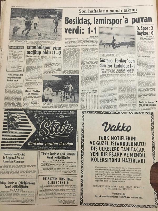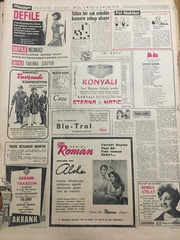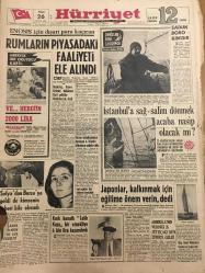 HÜRRİYET GAZETESİ 26 ARALIK 1965 YIL :18 SAYI :6344--Rumların piyasadaki faaliyeti ele alındı ---Farını söndürmeyen kamyon 6 kişinin ölümüne sebep oldu ---Sadun Boro kimdir --İstanbul da sağ -salim dönmek acaba nasip olacak mı ?--Japonlar ,kalkınmak için eğitime önem verin dedi --Kırık kanatlı talih kuşu bir emekliye 6 bin lira kazandırdı ---Amerikan nın verdiği 26 jet uçağı dün İzmir e geldi--Tütün bir çok erkekte kansere sebep oluyor ---Beşiktaş ,İzmirspor a puan verdi :1-1--İstanbulspor yine mağlup oldu :1-0--Göztepe Feriköy den dün zor kurtuldu --:1-1--D.Spor :3 Beykoz :0---Denktaş ,Kıbrıs Krizini hükümet kati şekilde halledecek dedi ---Sular idaresi tenkid ediliyor --Ulay ,Genel Müdürlerinin Tayinlerini Tenkit Etti --Sofya dan Bursa ya geldi ve kimsenin haberi bile olmadı --- Yıpranma, sararmalar, kupon kesiği ve yırtılmalar zamana bağlı olarak görülebilir.