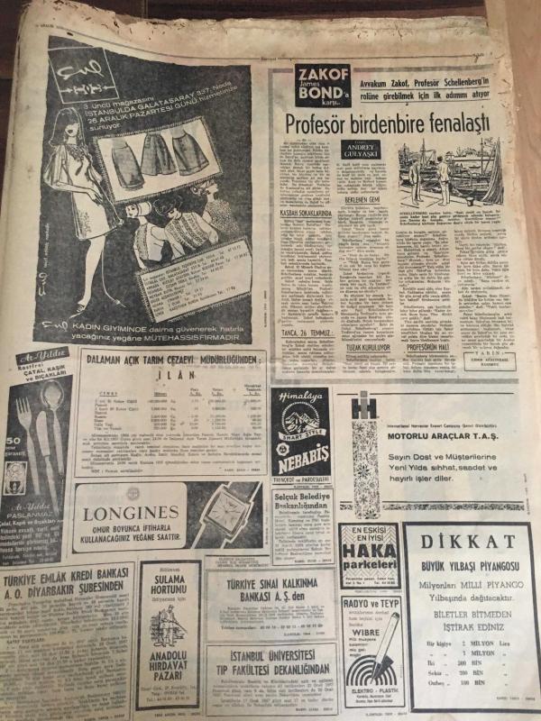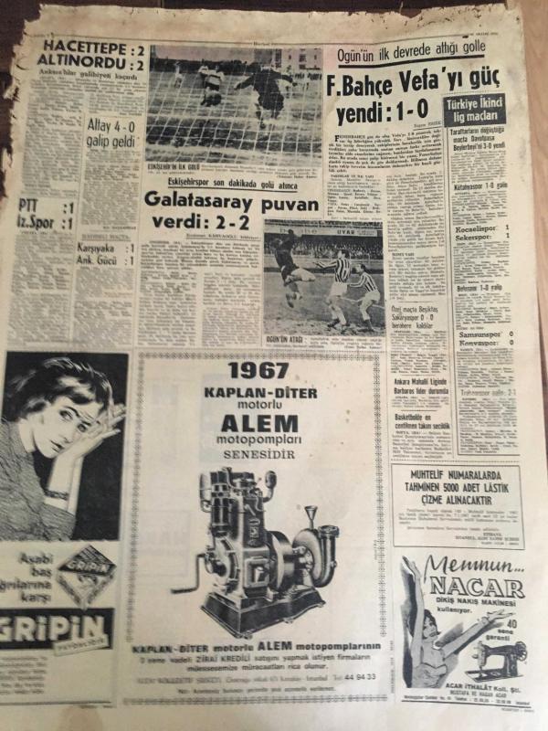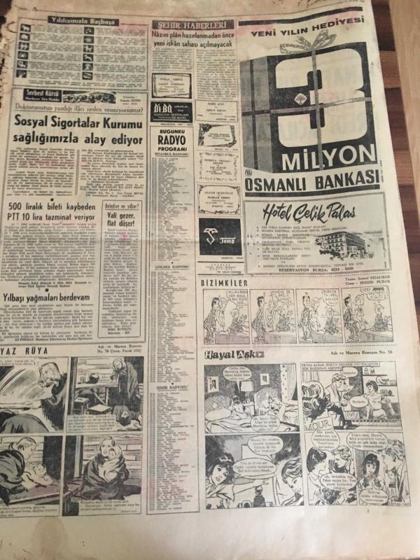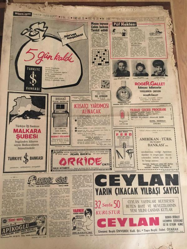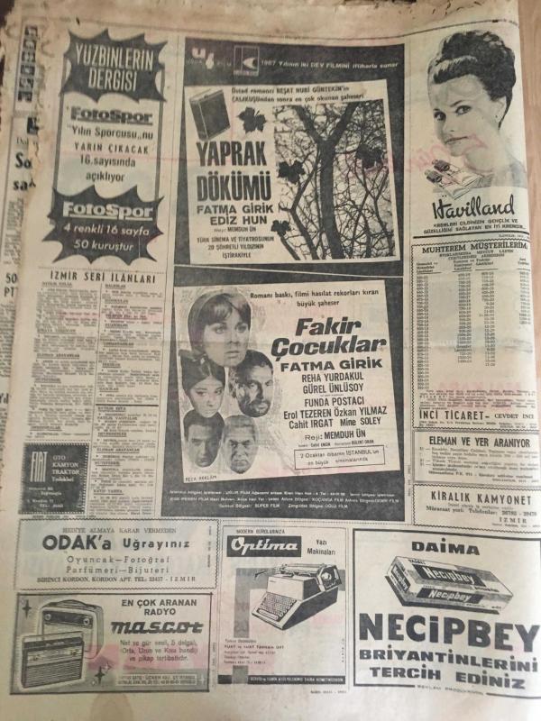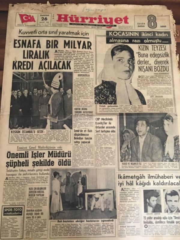 HÜRRİYET GAZETESİ 26 ARALIK 1966 YIL :19 SAYI :6704--- Esnafa bir milyar liralık kredi açılacak----- -Kosigin İstanbul 'u gezdi---CHP Meclisinde Ecevitçiler ile ortacılar arasında sert tartışma oldu ----İkametgah ilmühaberi ve iyi hal kağıdı kaldırılacak ----1967 yılının iki dev filmini iftiharla sunar :Yaprak Dökümü : Fatma Girik ,Ediz Hun -----Filmi hasılat rekorları kıran büyük şaheser : Fakir Çocuklar : Fatma Girik , Reha Yurdakul , Gürel Ünlüsoy ,Funda Postacı , Erol Tezeren ,Özkan Yılmaz , Cahit Irgat ,Mine Soley ----Hacettepe :2 Altınordu :2 ----Altay 4-0 -----PTT :1 İz.Spor :1---Eskişehir son dakika golü atınca :Galatasaray puan verdi :2-2 ---Fenerbahçe Vefa 'yı güç yendi :1-0 ---New York 'ta açılan Topkapı lokantası --- Turizm Bankası Yeniköy de 88 odalı bir otel inşa etmek için teşebbüse geçti --- Yıpranma, sararmalar, kupon kesiği ve yırtılmalar zamana bağlı olarak görülebilir.