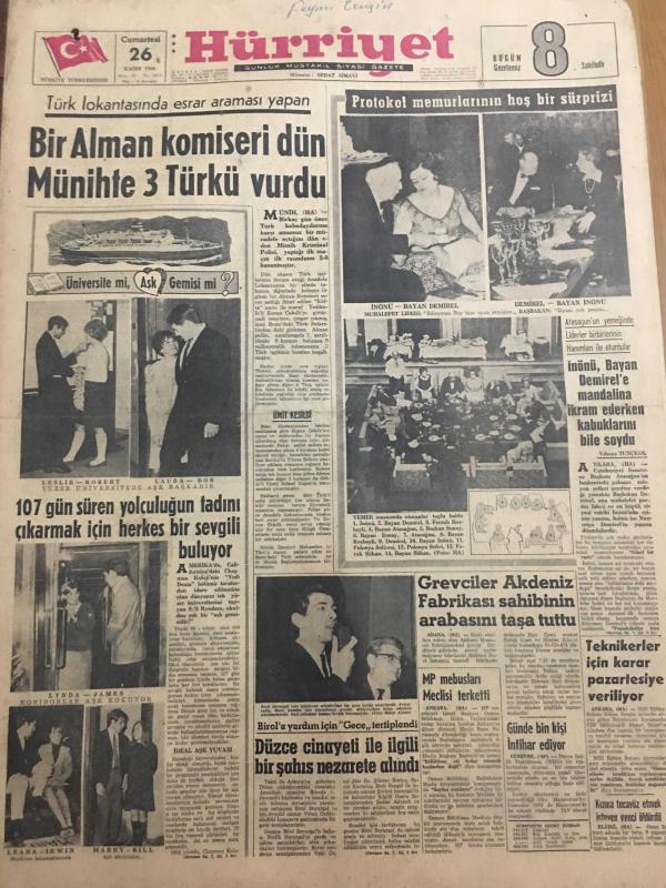 HÜRRİYET GAZETESİ 26 KASIM 1966 YIL :19 SAYI :6674--Bir Alman Komiseri Dün Münih te 3 Türkü Vurdu ---107 Gün süren yolculuğun tadını çıkarmak için herkes bir sevgili buluyor ---İnönü ,Bayan Demirel e mandalina ikram ederken kabuklarını bile soydu ---Grevciler Akdeniz Fabrikası sahibinin arabasını taşa tuttu ---Düzce cinayeti ile ilgili bir şahıs nezarete alındı ---MP Mebusları Meclisi Terk Etti ---Dolmuşlar rasgele indirme ve bindirme yapamayacak ---Kuzey İtalya da selden yeniden can kaybı oldu ---Gegiç :Altay ı yenmemiz normal dedi --Özcan a Almanlar Talip Oldu ---Galatasaray Ankaragücü ile oynuyor ---Hacettepeli Onursal ın alçıya alınan ayağını arkadaşları imzalıyor ---I Corvi Gözde Gruplar Arasına Girdi ---Artık pazarları evimizde olacağız --Elimiz böğrümüzde evde koca bekliyoruz ---Nuran Aksoy çok dertli --Günde bin kişi intihar ediyor ---Kızına tecavüz etmek isteyen genci öldürdü ---Teknikerler için karar pazartesiye veriliyor -- Yıpranma, sararmalar, kupon kesiği ve yırtılmalar zamana bağlı olarak görülebilir.