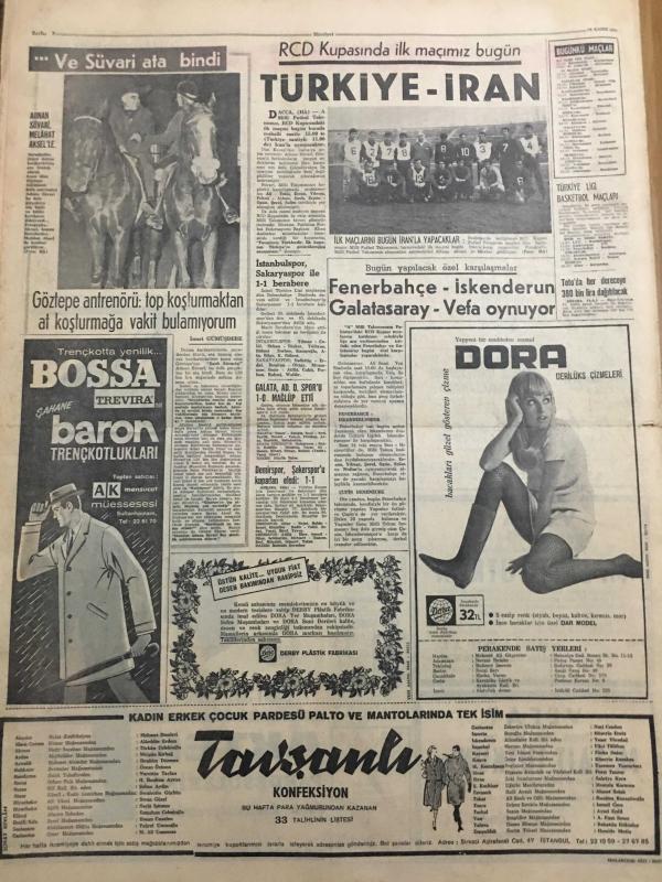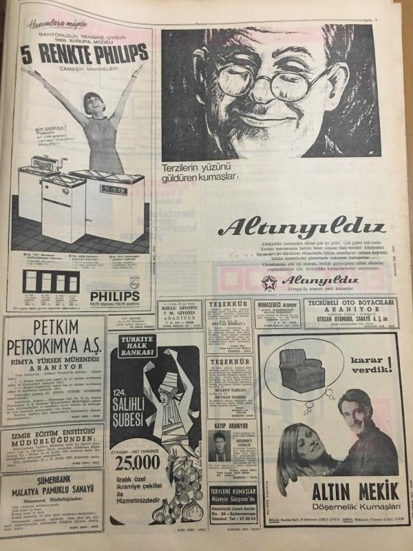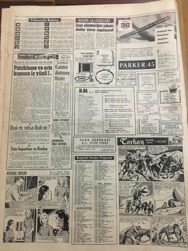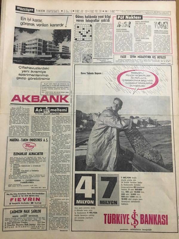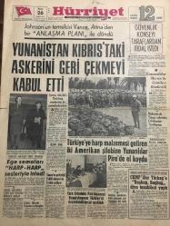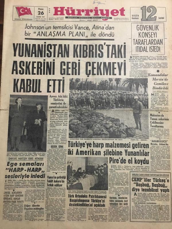 HÜRRİYET GAZETESİ 26 KASIM 1967 YIL :20 SAYI :7034---Yunanistan Kıbrıs ta ki Askerini Geri Çekmeyi Kabul Etti ---Ege semaları harp harp sesleriyle inledi ----Türkiye ye harp malzemesi getiren iki Amerikan şilebine Yunanlılar Pire de el koydu ---Türk Ortodoks Patrikhanesi Türkiye yi Desteklediklerini Açıkladı ---CKMP liler Türkeş e Başbuğ Başbuğ diye tezahürat yaptı ----Komandolar Mersin de Gemilere Bindirildi ----Sınav yönetmeliği yabancı okullar isterse uygulayacak ---Güneş hakkında yeni bilgi veren fotoğraflar çekildi --Türkiye -İran --Fenerbahçe -İskenderun Galatasaray -Vefa Oynuyor --Harriman Amerika nın Kıbrıs sorununda taraf tutmadığını ileri sürdü ---Er Film Berker İnanoğlu 1968 Yılı Süper Prodüksiyonu Sunmakla Şeref Duyar --Ayhan Işık Filiz Akın : Erikler Çiçek Açtı ---Yılmaz Güney ,Hülya Koçyiğit :Dağlar Delisi --Ayhan Işık Selda Alkor : Ayhan Işık Sevda Günü : Hesap Günü ---Er filmin 1967 yılı Prodüksiyonu : 1 -Gecelerin Kralı ,2-Ölüm Saati ,3-Affet Beni ,-- Yıpranma, sararmalar, kupon kesiği ve yırtılmalar zamana bağlı olarak görülebilir.