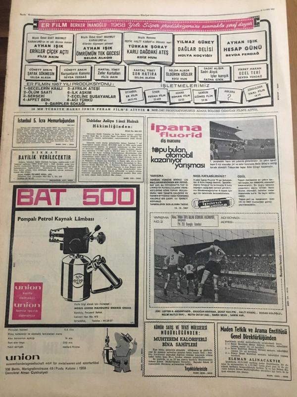 HÜRRİYET GAZETESİ 26 KASIM 1967 YIL :20 SAYI :7034---Yunanistan Kıbrıs ta ki Askerini Geri Çekmeyi Kabul Etti ---Ege semaları harp harp sesleriyle inledi ----Türkiye ye harp malzemesi getiren iki Amerikan şilebine Yunanlılar Pire de el koydu ---Türk Ortodoks Patrikhanesi Türkiye yi Desteklediklerini Açıkladı ---CKMP liler Türkeş e Başbuğ Başbuğ diye tezahürat yaptı ----Komandolar Mersin de Gemilere Bindirildi ----Sınav yönetmeliği yabancı okullar isterse uygulayacak ---Güneş hakkında yeni bilgi veren fotoğraflar çekildi --Türkiye -İran --Fenerbahçe -İskenderun Galatasaray -Vefa Oynuyor --Harriman Amerika nın Kıbrıs sorununda taraf tutmadığını ileri sürdü ---Er Film Berker İnanoğlu 1968 Yılı Süper Prodüksiyonu Sunmakla Şeref Duyar --Ayhan Işık Filiz Akın : Erikler Çiçek Açtı ---Yılmaz Güney ,Hülya Koçyiğit :Dağlar Delisi --Ayhan Işık Selda Alkor : Ayhan Işık Sevda Günü : Hesap Günü ---Er filmin 1967 yılı Prodüksiyonu : 1 -Gecelerin Kralı ,2-Ölüm Saati ,3-Affet Beni ,--, SEDAT SİMAVİ tarafından kaleme alınmıştır. Kitap 1967 yılında [HÜRRİYET MATBAA] yayınlanmıştır. 12 sayfadır. HÜRRİYET GAZETESİ 26 KASIM 1967 YIL :20 SAYI :7034---Yunanistan Kıbrıs ta ki Askerini Geri Çekmeyi Kabul Etti ---Ege semaları harp harp sesleriyle inledi ----Türkiye ye harp malzemesi getiren iki Amerikan şilebine Yunanlılar Pire de el koydu ---Türk Ortodoks Patrikhanesi Türkiye yi Desteklediklerini Açıkladı ---CKMP liler Türkeş e Başbuğ Başbuğ diye tezahürat yaptı ----Komandolar Mersin de Gemilere Bindirildi ----Sınav yönetmeliği yabancı okullar isterse uygulayacak ---Güneş hakkında yeni bilgi veren fotoğraflar çekildi --Türkiye -İran --Fenerbahçe -İskenderun Galatasaray -Vefa Oynuyor --Harriman Amerika nın Kıbrıs sorununda taraf tutmadığını ileri sürdü ---Er Film Berker İnanoğlu 1968 Yılı Süper Prodüksiyonu Sunmakla Şeref Duyar --Ayhan Işık Filiz Akın : Erikler Çiçek Açtı ---Yılmaz Güney ,Hülya Koçyiğit :Dağlar Delisi --Ayhan Işık Selda Alkor : Ayhan Işık Sevda Günü : Hesap Günü ---Er filmin 1967 yılı Prodüksiyonu : 1 -Gecelerin Kralı ,2-Ölüm Saati ,3-Affet Beni ,-- adlı eser Türkçe dilindedir.