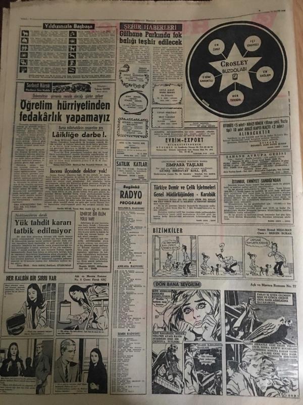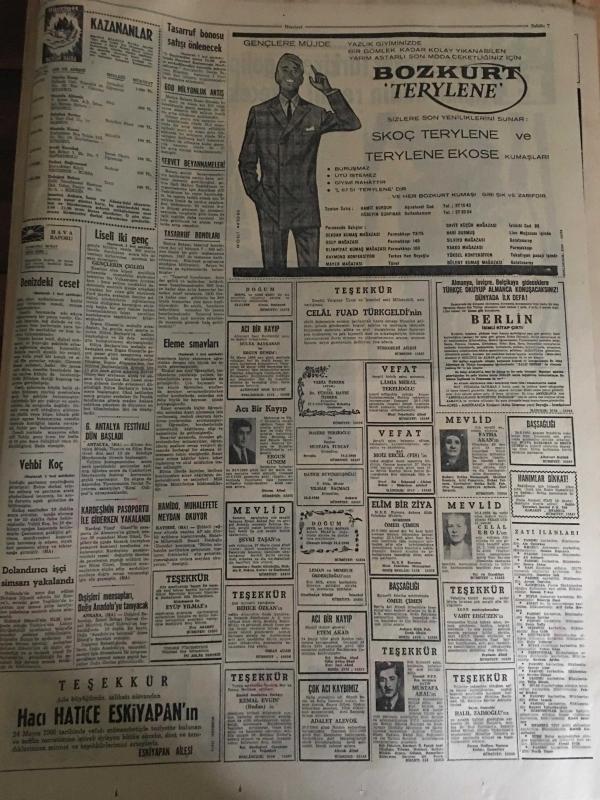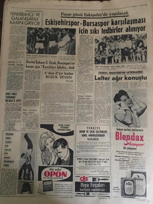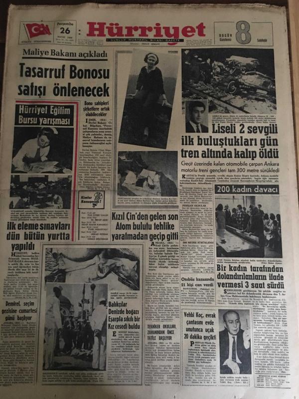 HÜRRİYET GAZETESİ 26 MAYIS 1966 YIL :19 SAYI :6490---Tasarruf Bonosu Satışı Önlenecek ---İlk eleme sınavları dün bütün yurtta yapıldı --Liseli 2 sevgili buluştukları gün tren altında kalıp öldü --Kızıl Çin den gelen son atom bulutu tehlike yaratmadan geçip gitti ---Balıkçılar denizde boğazı eşarpla sıkılı bir kız cesedi buldu ---Bir kadın tarafından dolandırılanların ifade vermesi 3 saat sürdü ---Vehbi Koç evrak çantasını evde unutunca uçak 20 dakika gecikti ---Doktor ,kadın hastası ile tedavi yerine aşk yaptı ---Fenerbahçe ve Galatasaray Kampa Giriyor --Eskişehirspor -Bursaspor karşılaşması için sıkı tedbirler alınıyor ---Devlet Bakanı K.Ocak ,Bursaspor un kararı için kendileri bilirler dedi ---Lefter ağır konuştu ---Jean Straker Türkiye ye gelip Çıplak Resmi Çekecek --Otobüs kazasında 21 kişi can verdi ---Demirel seçim gezisine cumartesi günü başlıyor ----