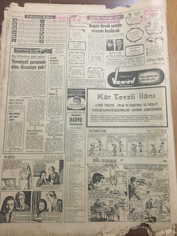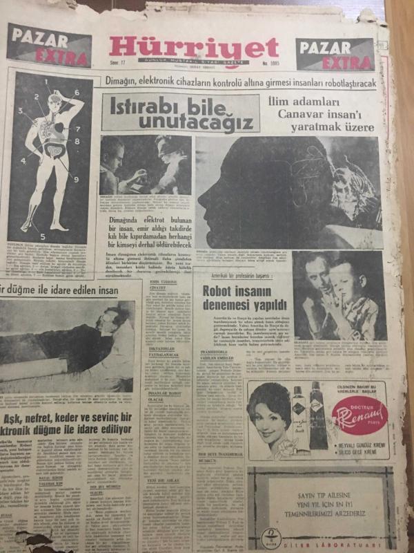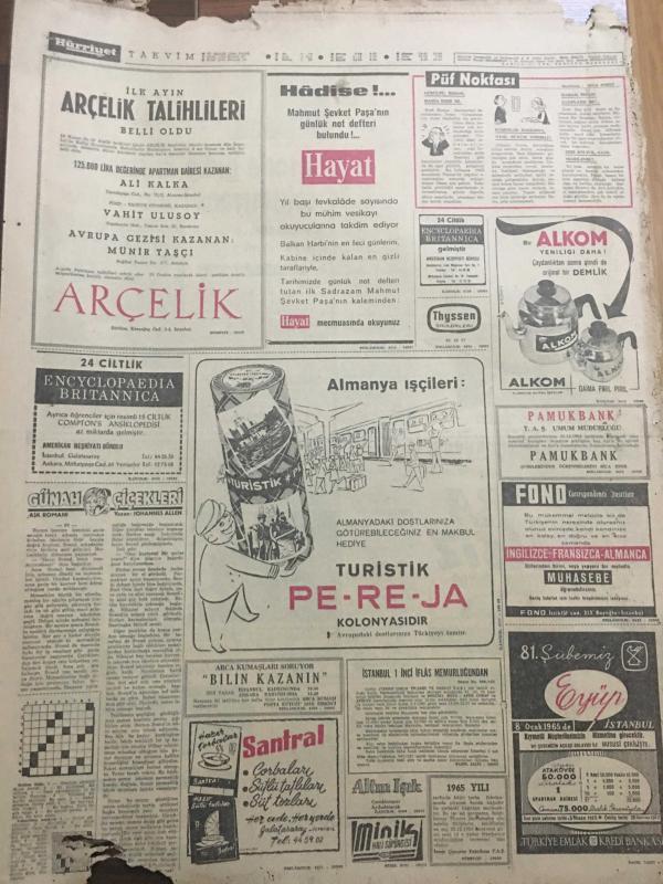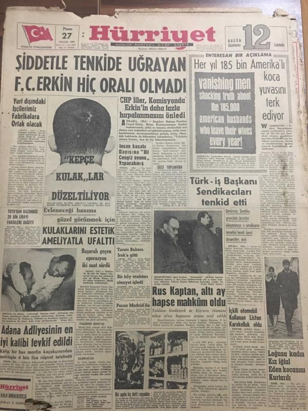 HÜRRİYET GAZETESİ 27 ARALIK 1964 YIL :17 SAYI :5985--Şiddetle tenkide uğrayan F.C.Erkin Hiç Oralı Olmadı --Yurt dışındaki işçilerimiz fabrikalara ortak olacak ---CHP liler Komisyonda Erkin 'in daha fazla hırpalanmasını önledi ---Kulaklarını estetik ameliyatla ufalttı ---Her yıl 185 bin Amerikalı koca yuvasını terk ediyor ---Türk -İş Başkanı Sendikacıları Tenkid Etti --Rus Kaptan altı ay hapse mahkum oldu --Adana Adliyesinin En İyi Katibi Tevkif Edildi ---Radyo Programları --Robot insanın denemesi yapıldı ---Batan Titanik e yardım edebilirdik ---Gömülmesinden 39 yıl sonra ölen hükümdar ---Aşka başka flört başka ---Denizlerin dibi artık bizim olacak --İsveç e gidip Ericsson da çalışmayan Türk yoktur ---Arçelik :Her yuvaya sağlık ve konfor diler ---Fenerbahçe 80 . dakika da galip :1-0---Portekiz Milli Maçı İçin Can Davet Edilmeyecek ---G.Birliği Beykoz a şans tanımadı :2-1----Kasımpaşa M.Yolaç tan Yardım İstedi ---Loğusa kadın kız iğfal eden kocasını kurtardı ---- Yıpranma, sararmalar, kupon kesiği ve yırtılmalar zamana bağlı olarak görülebilir.