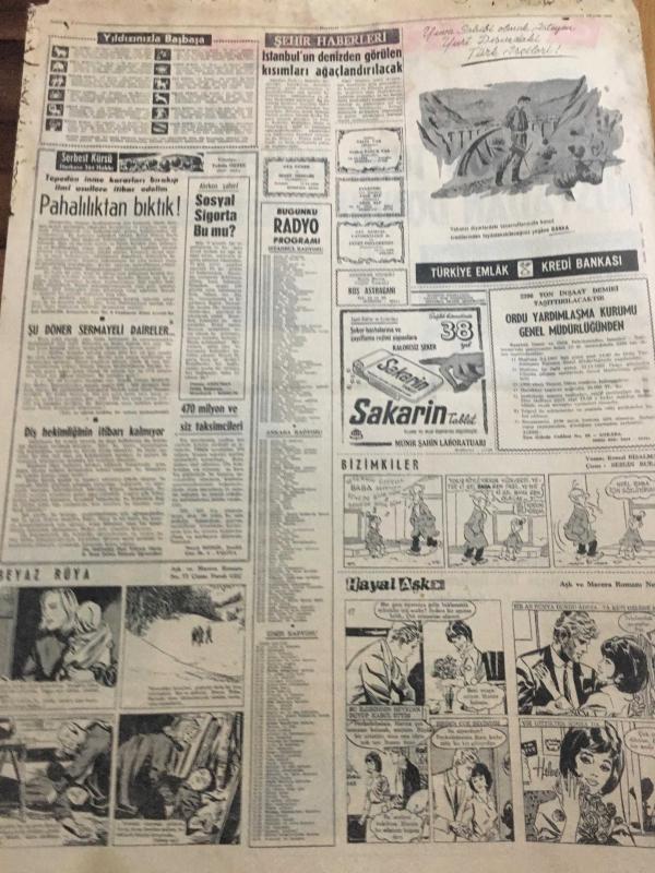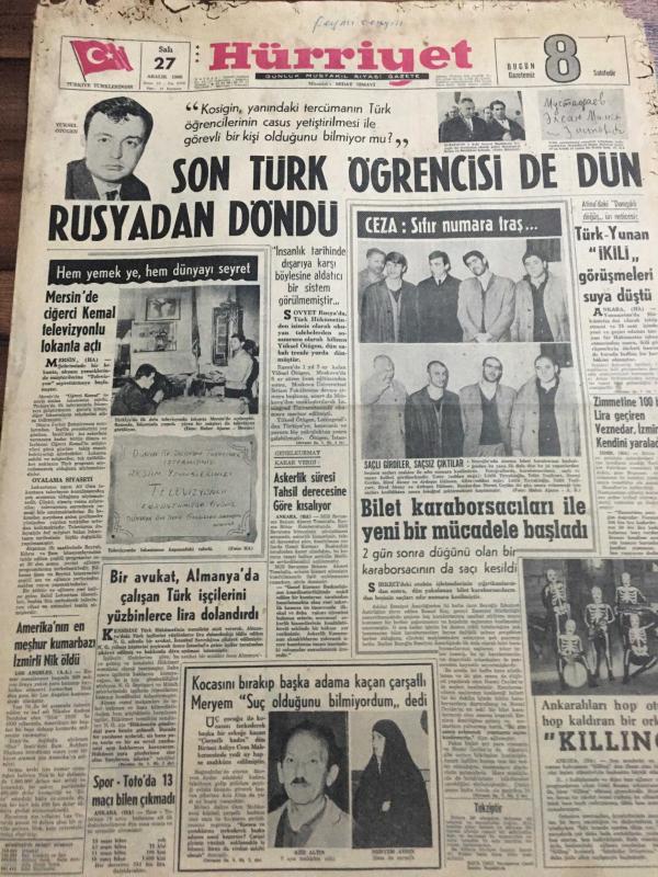 HÜRRİYET GAZETESİ 27 ARALIK 1966 YIL :19 SAYI : 6705---Son Türk öğrencisi de dün Rusya 'dan döndü ---Amerika 'nın en meşhur kumarbazı da İzmirli Nik öldü ----Askerlik süresi tahsil derecesine göre kısalıyor ---Bilet karaborsacılar ile yeni bir mücadele başladı ---- Zimmetine 100 bin dolar geçiren veznedar ,İzmir de kendini yaraladı ---Türk -Yunan ikili görüşmeleri suya düştü ----Kılıç :Eskişehir de canımızı zor kurtardık --Beşiktaş -Fenerbahçe Yeni yılın ilk günü karşılaşacaklar ---Bir ana -oğul 17 yıl sonra buluştular ---İri -yarı zenci güzeli Leydi Bella :Daracık kafes içinde aslanla boğuşuyor --- Yıpranma, sararmalar, kupon kesiği ve yırtılmalar zamana bağlı olarak görülebilir.