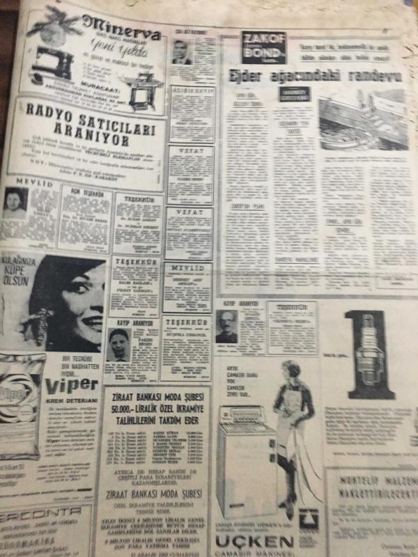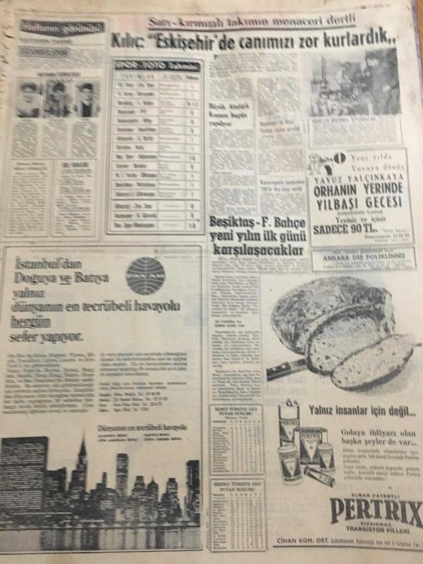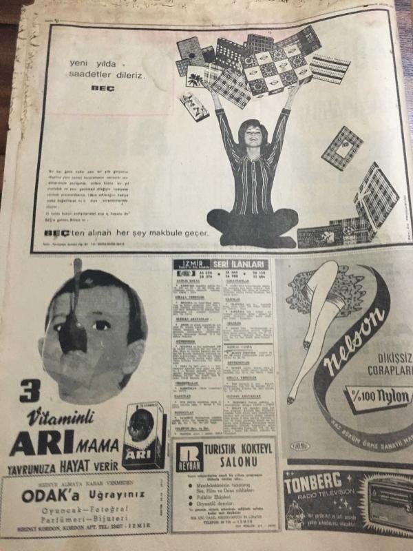 HÜRRİYET GAZETESİ 27 ARALIK 1966 YIL :19 SAYI : 6705-Perihan Altındağ Sözeri,Ankara içkisiz Beyaz Saray gazinosu’nda reklamı-Mersin’li ciğerci Kemal,televizyonlu lokanta açtı,”hem yemek ye,hem dünyayı seyret”-Killing Okestrası Ankara’da -Kocasını bırakıp başka adama kaçan çarşaflı Meryem”Suç olduğunu bilmiyordum”dedi fotoğraflı haberi-Son Türk öğrencisi de dün Rusya 'dan döndü ---Amerika 'nın en meşhur kumarbazı da İzmirli Nik öldü ----Askerlik süresi tahsil derecesine göre kısalıyor ---Bilet karaborsacılar ile yeni bir mücadele başladı ---- Zimmetine 100 bin dolar geçiren veznedar ,İzmir de kendini yaraladı ---Türk -Yunan ikili görüşmeleri suya düştü ----Kılıç :Eskişehir de canımızı zor kurtardık --Beşiktaş -Fenerbahçe Yeni yılın ilk günü karşılaşacaklar ---Bir ana -oğul 17 yıl sonra buluştular ---İri -yarı zenci güzeli Leydi Bella :Daracık kafes içinde aslanla boğuşuyor --- adlı eser, Kitap > Süreli Yayınlar > Gazeteler > Türkiye > Genel > Günlük kategorisinde İkinci El olarak satıştadır.