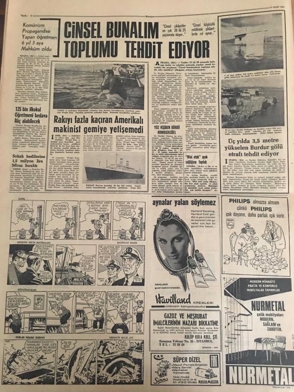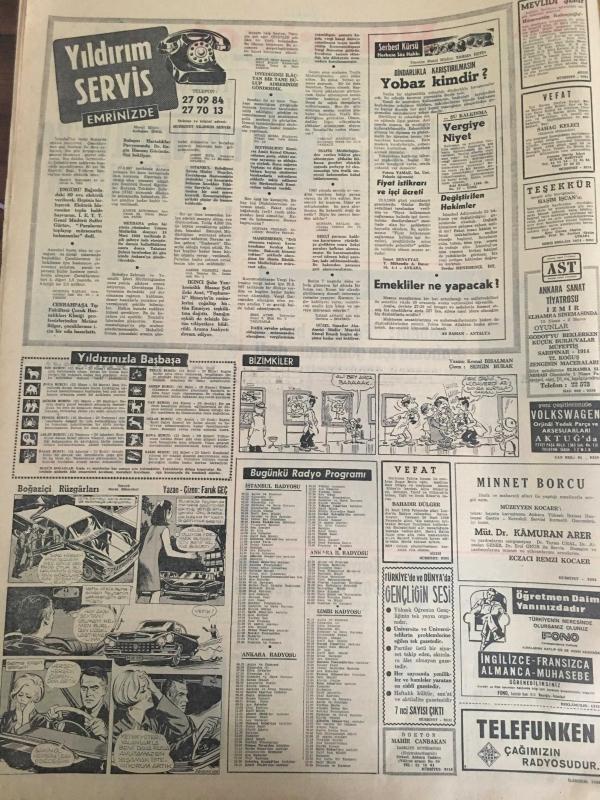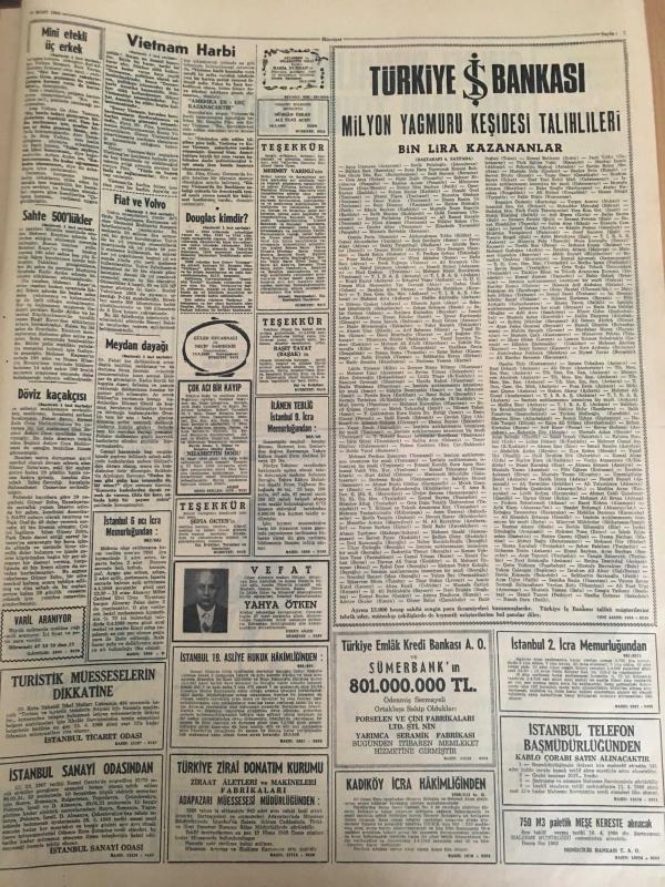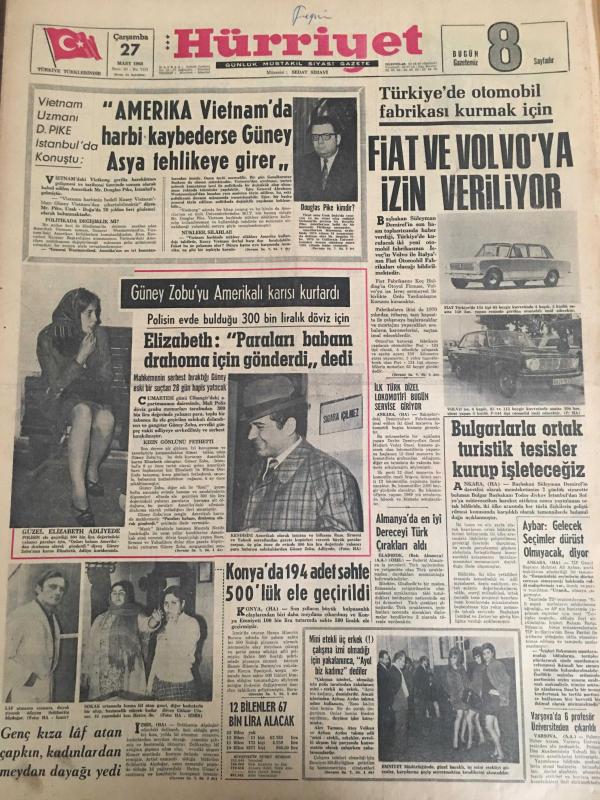 HÜRRİYET GAZETESİ 27 MART 1968 YIL :20 SAYI :7151--Amerika Vietnam da harbi kaybederse Güney Asya tehlikeye girer ---Elizabeth : Paraları babam drahoma için gönderdi dedi --Fiat ve Volvo ya izin veriliyor ---Bulgarlar ortak turistik tesisler kurup işleteceğiz ---Almanya da en iyi dereceyi Türk çırakları aldı ---Konya da 194 adet sahte 500 lük ele geçirildi ---Dünya da bir yıl içinde 100 bin kişi trafik kazasında ölüyor ---Fenerbahçe ,D.Sporla oynuyor --Trabzon da oynayacak Türkiye -Irak ordu maçı yarına tehir edildi ---Bursalılar Yılmaz ı istenmeyen adam olarak ilan etti ---Dolmabahçe Stadı 80 bin kişi alacak şekilde büyütülecek ---Cinsel Bunalım Toplumu Tehdit Ediyor ---Rakıyı fazla kaçıran Amerikalı makinist gemiye yetişemedi ---125 bin ilkokul öğretmeni bedava ilaç alabilecek ----Üç yılda 3,5 metre yükselen Burdur Gölü etrafı tehdit ediliyor ---Aybar :Gelecek Seçimler dürüst olmayacak diyor ----Genç kıza laf atan çapkın kadınlardan meydan dayağı yedi --- Yıpranma, sararmalar, kupon kesiği ve yırtılmalar zamana bağlı olarak görülebilir.
