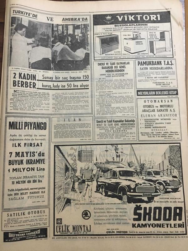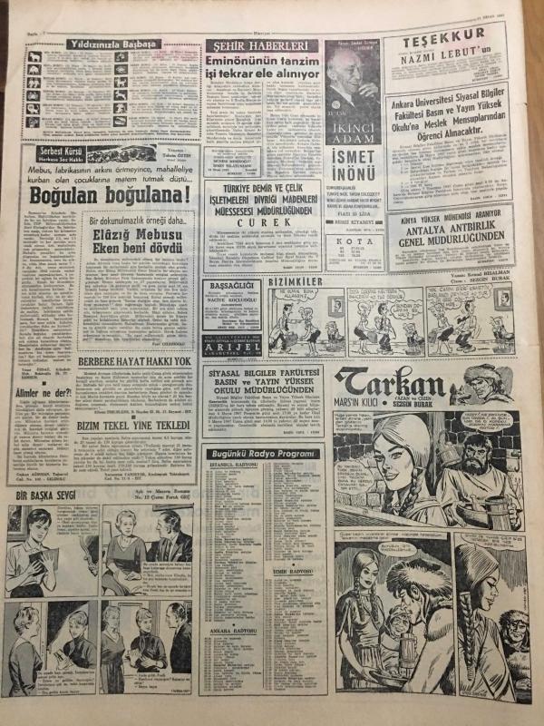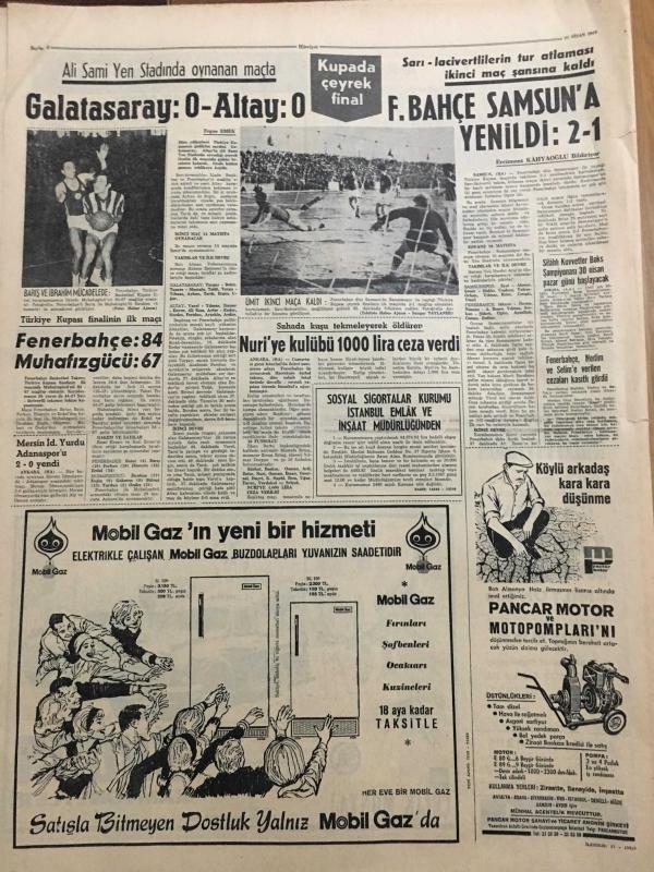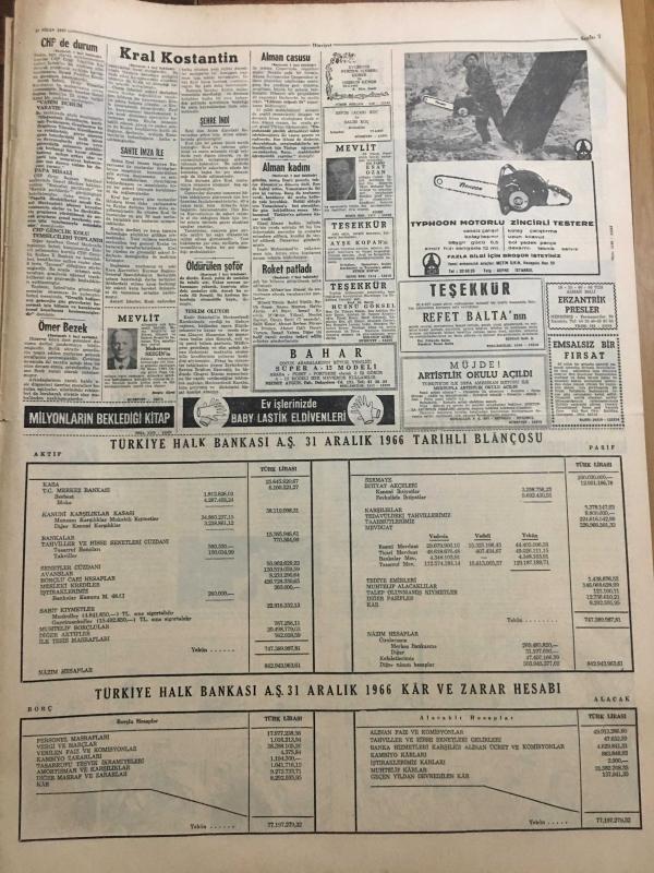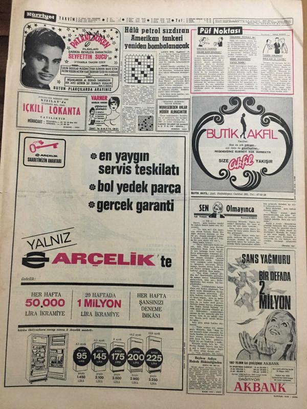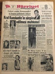 HÜRRİYET GAZETESİ 27 NİSAN 1967 YIL :19 SAYI :6821--Kral Konstantin in sürgün edilmesi muhtemel --Turistler Türkiye ye Gelmeye Başladılar ---İğfal ettiği 16 yaşındaki kızı almayan şoför öldürüldü --Ö.Bezek Çetesi Hamido nun Köyünü Bastı ---İş ortağının iki kızını öldürdükten sonra intihar etti --Alman casusu :ilk işim beni sabırla bekleyen nişanlım ile evlenmek dedi ---Bir Alman kadını 19 bin mermi sokarken yakalandı ---Jandarmalar arasında çıkan kavgada 3 er sten tabanca ile öldürüldü ---Palandöken Plakları : Seyfettin Sucu ---Hala petrol sızdıran Amerikan tankeri yeniden bombalanacak ---Galatasaray :0 -Altay :0---Fenerbahçe Samsun a yenildi --Fenerbahçe :84 Muhafızgücü :67---Nuri ye kulübü 1000 lira ceza verdi ---Uzayda ilk kaza ve kurbanı ---6.400 metreden düşerek parçalanan Albay ın ölümü bilginleri düşündürüyor ---Bir mektubunda hayat çok kısa korkuyorum diye yazmıştı---Kamyonda hurda demirler arasında bulunan roket patladı ,1 ölü 18 de yaralı var --- Yıpranma, sararmalar, kupon kesiği ve yırtılmalar zamana bağlı olarak görülebilir.