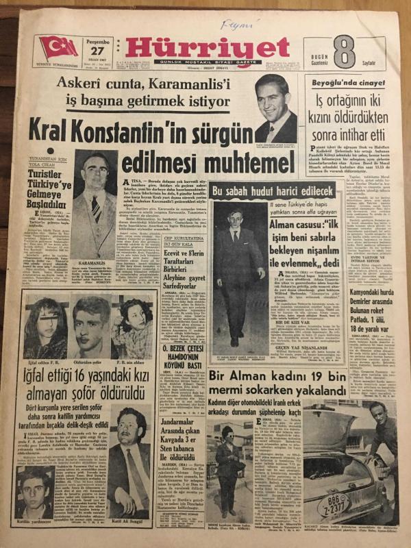 HÜRRİYET GAZETESİ 27 NİSAN 1967 YIL :19 SAYI :6821--Kral Konstantin in sürgün edilmesi muhtemel --Turistler Türkiye ye Gelmeye Başladılar ---İğfal ettiği 16 yaşındaki kızı almayan şoför öldürüldü --Ö.Bezek Çetesi Hamido nun Köyünü Bastı ---İş ortağının iki kızını öldürdükten sonra intihar etti --Alman casusu :ilk işim beni sabırla bekleyen nişanlım ile evlenmek dedi ---Bir Alman kadını 19 bin mermi sokarken yakalandı ---Jandarmalar arasında çıkan kavgada 3 er sten tabanca ile öldürüldü ---Palandöken Plakları : Seyfettin Sucu ---Hala petrol sızdıran Amerikan tankeri yeniden bombalanacak ---Galatasaray :0 -Altay :0---Fenerbahçe Samsun a yenildi --Fenerbahçe :84 Muhafızgücü :67---Nuri ye kulübü 1000 lira ceza verdi ---Uzayda ilk kaza ve kurbanı ---6.400 metreden düşerek parçalanan Albay ın ölümü bilginleri düşündürüyor ---Bir mektubunda hayat çok kısa korkuyorum diye yazmıştı---Kamyonda hurda demirler arasında bulunan roket patladı ,1 ölü 18 de yaralı var ---