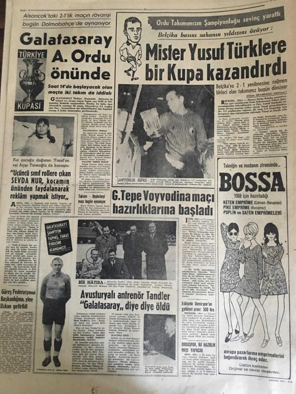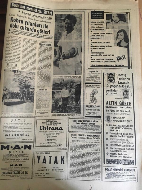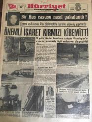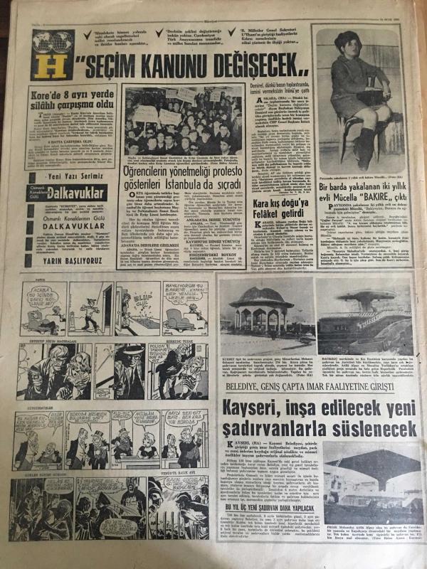 HÜRRİYET GAZETESİ 27 OCAK 1968 YIL :20 SAYI :7094---Önemli işaret kırmızı kiremitti --Kuzey Kutbunda Beyaz Ayılara Etiket Konacak --Kobra yılanları ile dolu çukurda gösteri ---Galatasaray A.Ordu Önünde ---Mister Yusuf Türklere Bir Kupa Kazandırdı ---Üçüncü sınıf rollerle çıkan Sevda Nur , kocamın önünden faydalanarak reklam yapmak istiyor ---G.Tepe Voyvodina maçı hazırlıklarına başladı ---Güreş Federasyonu Başkanlığına yine Uskan Getirildi ---Avusturyalı antrenör Tandler Galatasaray diye diye öldü ---Casus Manukyan ın işbirliği yaptığı Sovyet diplomatı dün apar -topar Türkiye yi terk etti ---Seçim Kanunu Değişecek ----Kayseri inşa edilecek yeni şadırvanlarla süslenecek ---Manukyan Türkiye aleyhinde gizli bilgileri koyduğu bu kayanın yanında yakalandı -- Yıpranma, sararmalar, kupon kesiği ve yırtılmalar zamana bağlı olarak görülebilir.